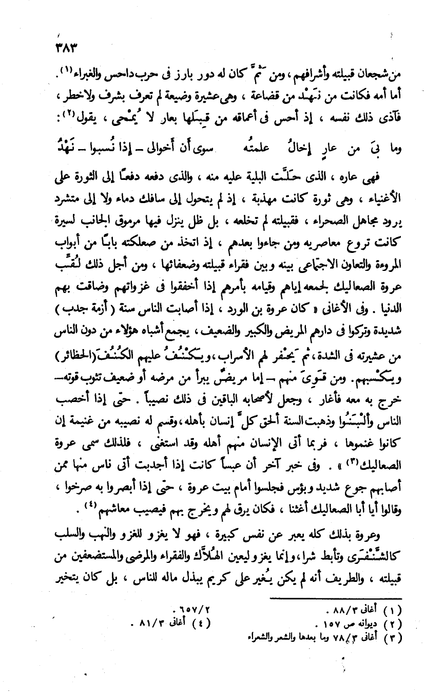 فهى عاره، الذى حلّت البلية عليه منه، والذى دفعه دفعا إلى الثورة على الأغنياء، وهى ثورة كانت مهذبة، إذ لم يتحول إلى سافك دماء ولا إلى متشرد يرود مجاهل الصحراء، فقبيلته لم تخلعه، بل ظل ينزل فيها مرموق الجانب لسيرة كانت تروع معاصريه ومن جاءوا بعدهم، إذ اتخذ من صعلكته بابا من أبواب المروءة والتعاون الاجتماعى بينه وبين فقراء قبيلته وضعفائها، ومن أجل ذلك لقّب عروة الصعاليك لجمعه إياهم وقيامه بأمرهم إذا أخفقوا فى غزواتهم وضاقت بهم الدنيا. وفى الأغانى «كان عروة بن الورد، إذا أصابت الناس سنة (أزمة جدب) شديدة وتركوا فى دارهم المريض والكبير والضعيف، يجمع أشباه هؤلاء من دون الناس من عشيرته فى الشدة، ثم يحفر لهم الأسراب، ويكنف عليهم الكنف (الحظائر) ويكسبهم. ومن قوى منهم-إما مريض يبرأ من مرضه أو ضعيف تثوب قوته- خرج به معه فأغار، وجعل لأصحابه الباقين فى ذلك نصيبا. حتى إذا أخصب الناس وألبنوا وذهبت السنة ألحق كلّ إنسان بأهله، وقسم له نصيبه من غنيمة إن كانوا غنموها، فربما أتى الإنسان منهم أهله وقد استغنى، فلذلك سمى عروة الصعاليك (¬3)». وفى خبر آخر أن عبسا كانت إذا أجدبت أتى ناس منها ممن أصابهم جوع شديد وبؤس فجلسوا أمام بيت عروة، حتى إذا أبصروا به صرخوا، وقالوا أيا أبا الصعاليك أغثنا، فكان يرق لهم ويخرج بهم فيصيب معاشهم (¬4).