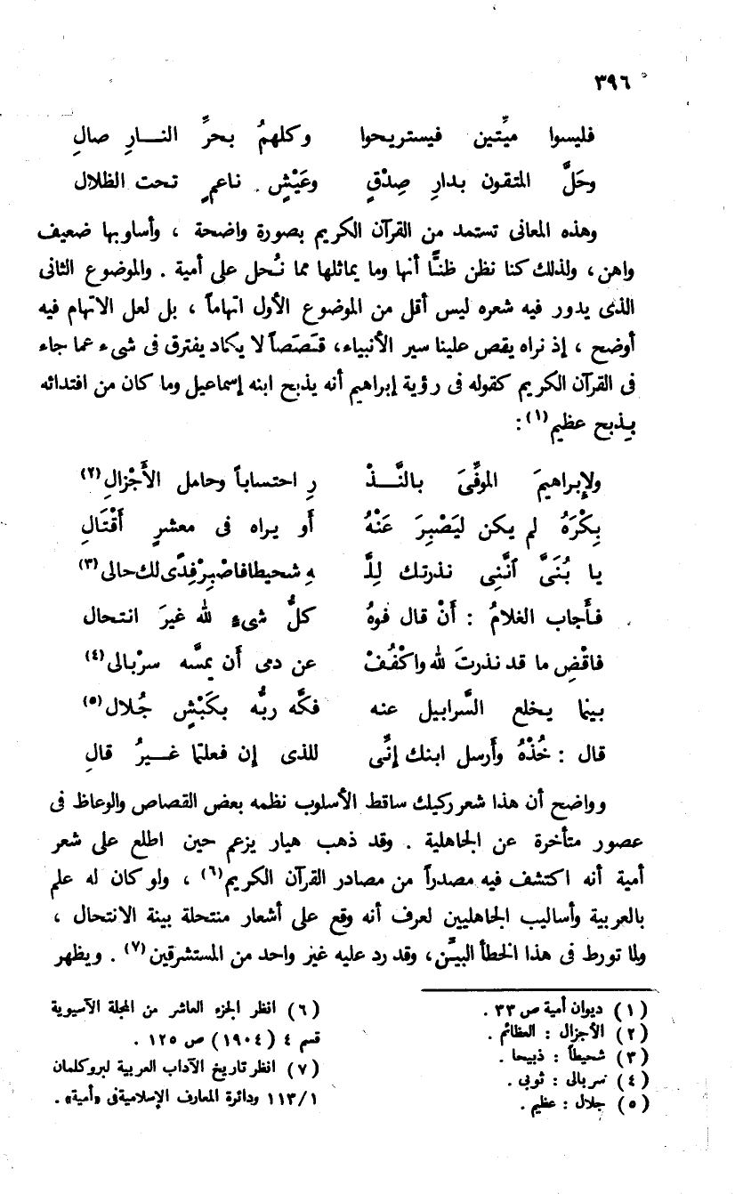 وهذه المعانى تستمد من القرآن الكريم بصورة واضحة، وأسلوبها ضعيف واهن، ولذلك كنا نظن ظنّا أنها وما يماثلها مما نحل على أمية. والموضوع الثانى الذى يدور فيه شعره ليس أقل من الموضوع الأول اتهاما، بل لعل الاتهام فيه أوضح، إذ نراه يقص علينا سير الأنبياء قصصا لا يكاد يفترق فى شئ عما جاء فى القرآن الكريم كقوله فى رؤية إبراهيم أنه يذبح ابنه إسماعيل وما كان من افتدائه بذبح عظيم (¬1):
