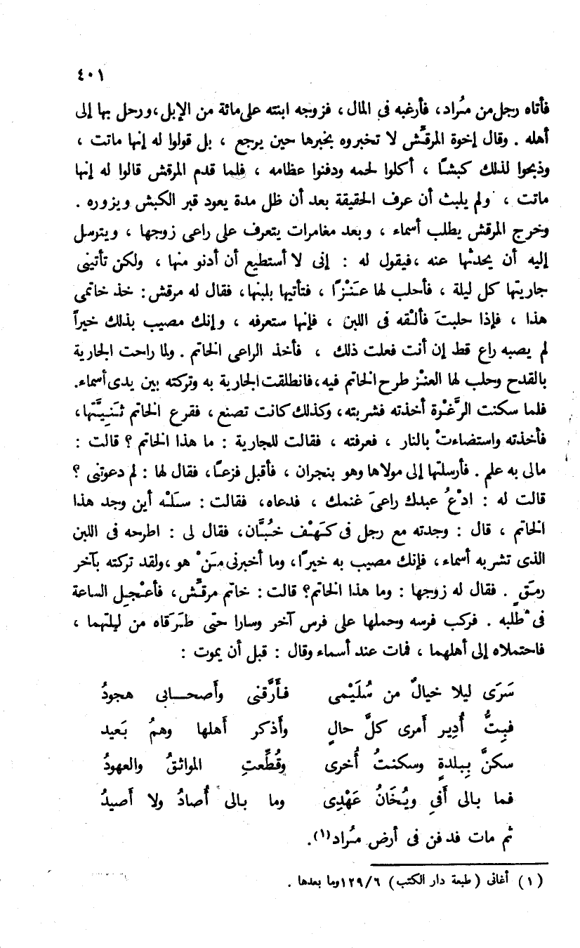 مالى به علم. فأرسلتها إلى مولاها وهو بنجران، فأقبل فزعا، فقال لها: لم دعوتنى؟ قالت له: ادع عبدك راعى غنمك، فدعاه، فقالت: سله أين وجد هذا الخاتم، قال: وجدته مع رجل فى كهف خبّان، فقال لى: اطرحه فى اللبن الذى تشربه أسماء، فإنك مصيب به خيرا، وما أخبرنى من هو، ولقد تركته بآخر رمق. فقال لها زوجها: وما هذا الخاتم؟ قالت: خاتم مرقّش، فأعجل الساعة فى طلبه. فركب فرسه وحملها على فرس آخر وسارا حتى طرقاه من ليلتهما، فاحتملاه إلى أهلهما، فمات عند أسماء وقال قبل أن يموت: