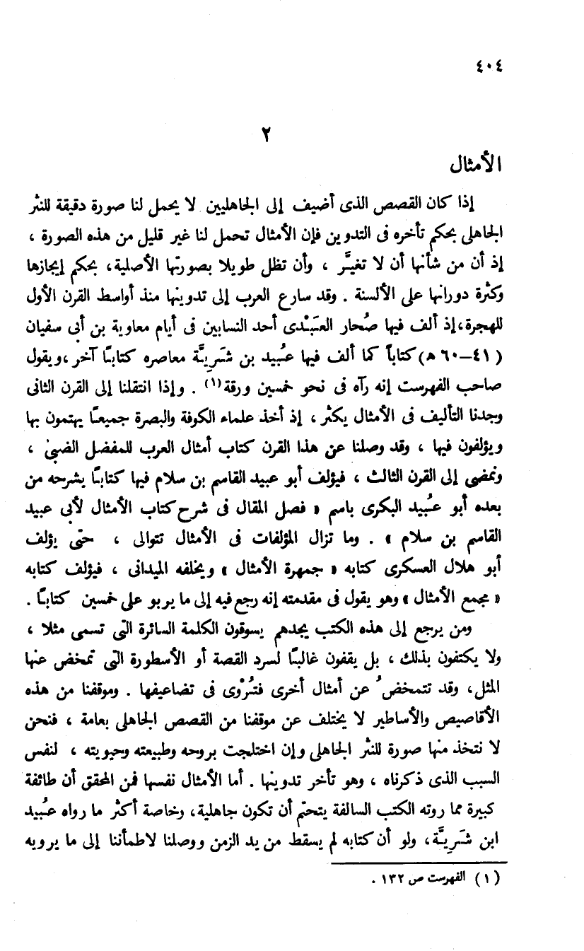 ومن يرجع إلى هذه الكتب يجدهم يسوقون الكلمة السائرة التى تسمى مثلا، ولا يكتفون بذلك، بل يقفون غالبا لسرد القصة أو الأسطورة التى تمخض عنها المثل، وقد تتمخض عن أمثال أخرى تروى فى تضاعيفها. وموقفنا من هذه الأقاصيص والأساطير لا يختلف عن موقفنا من القصص الجاهلى بعامة، فنحن لا نتخذ منها صورة للنثر الجاهلى وإن اختلجت بروحه وطبيعته وحيويته، لنفس السبب الذى ذكرناه، وهو تأخر تدوينها. أما الأمثال نفسها فمن المحقق أن طائفة كبيرة مما روته الكتب السالفة يتحتم أن يكون جاهليا، وخاصة أكثر ما رواه عبيد ابن شريّة، ولو أن كتابه لم يسقط من يد الزمن ووصلنا لاطمأننا إلى ما يرويه