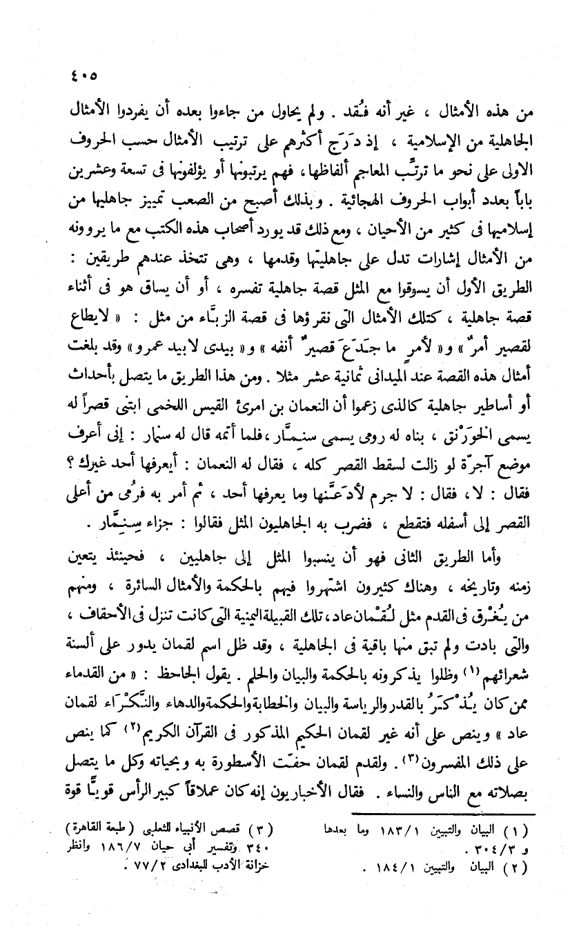 وأما الطريق الثانى فهو أن ينسبوا المثل إلى جاهليين، فحينئذ يتعين زمنه وتاريخه، وهناك كثيرون اشتهروا فيهم بالحكمة والأمثال السائرة، ومنهم من يغرق فى القدم مثل لقمان عاد، تلك القبيلة اليمنية التى كانت تنزل فى الأحقاف، والتى بادت ولم تبق منها باقية فى الجاهلية. وقد ظل اسم لقمان يدور على ألسنة شعرائهم (¬1) وظلوا يذكرونه بالحكمة والبيان والحلم. يقول الجاحظ: «من القدماء ممن كان يذكر بالقدر والرياسة والبيان والخطابة والحكمة والدهاء والنّكراء لقمان عاد» وينص على أنه غير لقمان الحكيم المذكور فى القرآن الكريم (¬2) كما ينص على ذلك المفسرون (¬3). ولقدم لقمان حفت الأسطورة به وبحياته وكل ما يتصل بصلاته مع الناس والنساء. فقال الأخباريون إنه كان عملاقا كبير الرأس قويا قوة