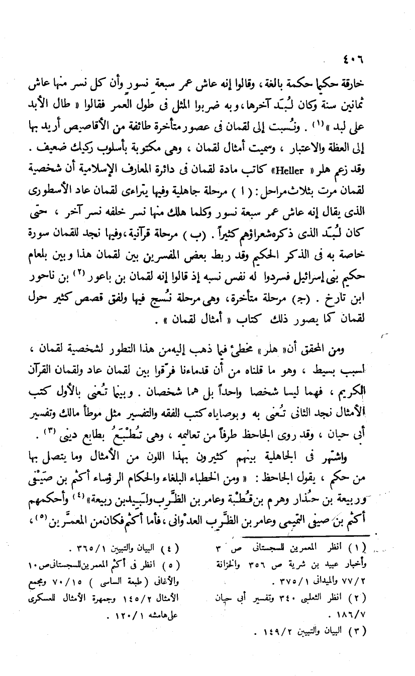 وقد زعم هلر «Heller» كاتب مادة لقمان فى دائرة المعارف الإسلامية أن شخصية لقمان مرت بثلاث مراحل: (ا) مرحلة جاهلية وفيها يتراءى لقمان عاد الأسطورى الذى يقال إنه عاش عمر سبعة نسور وكلما هلك منها نسر خلفه نسر آخر، حتى كان لبد الذى ذكره شعراؤهم كثيرا (ب) مرحلة قرآنية، وفيها نجد للقمان سورة خاصة به فى الذكر الحكيم وقد ربط بعض المفسرين بين لقمان هذا وبين بلعام حكيم بنى إسرائيل فسردوا له نفس نسبه إذ قالوا إنه لقمان بن باعور (¬2) بن ناحور ابن تارخ. (ج) مرحلة متأخرة، وهى مرحلة نسج فيها ولفّق قصص كثير حول لقمان كما يصور ذلك كتاب «أمثال لقمان».