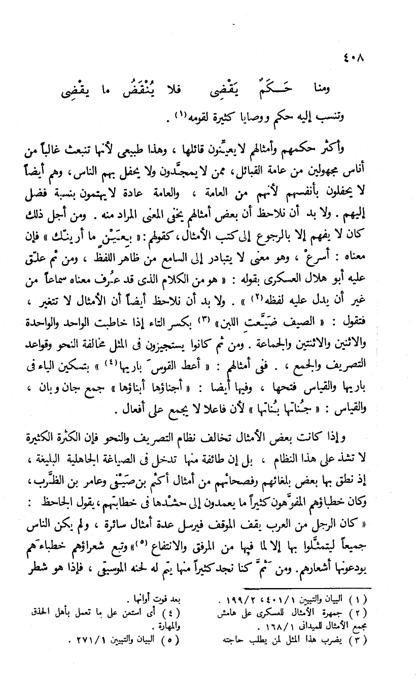على أن أكثر حكمهم وأمثالهم لا يعيّنون قائلها، وهذا طبيعى لأنها تنبعث غالبا من أناس مجهولين من عامة القبائل، ممن لا يمجّدون ولا يحفل بهم الناس، وهم أيضا لا يحفلون بأنفسهم لأنهم من العامة، والعامة عادة لا يهتمون بنسبة فضل إليهم. ولا بد أن نلاحظ أن بعض أمثالهم يخفى المعنى المراد منه، ومن أجل ذلك كان لا يفهم إلا بالرجوع إلى كتب الأمثال، كقولهم: «بعين ما أرينّك» فإن معناه: أسرع، وهو معنى لا يتبادر إلى السامع من ظاهر اللفظ، ومن ثم علّق عليه أبو هلال العسكرى بقوله: «هو من الكلام الذى قد عرف معناه سماعا من غير أن يدل عليه لفظه (¬2)». ولا بد أن نلاحظ أيضا أن الأمثال لا تتغير، فتقول: «الصيف ضيّعت اللبن (¬3)» بكسر التاء إذا خاطبت الواحد والواحدة والاثنين والاثنتين والجماعة. ومن ثم كانوا يستجيزون فى المثل مخالفة النحو وقواعد التصريف والجمع، ففى أمثالهم: «أعط القوس باريها (¬4)» بتسكين الياء فى باريها والقياس فتحها، وفيها أيضا: «أجناؤها أبناؤها» جمع جان وبان، والقياس.
