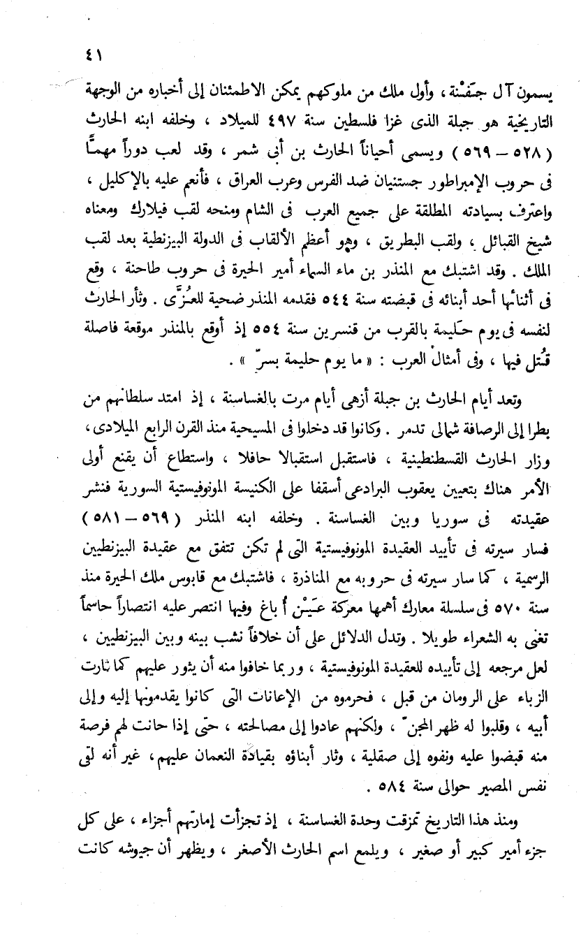 وتعد أيام الحارث بن جبلة أزهى أيام مرت بالغساسنة، إذ امتد سلطانهم من بطرا إلى الرصافة شمالى تدمر. وكانوا قد دخلوا فى المسيحية منذ القرن الرابع الميلادى، وزار الحارث القسطنطينية، فاستقبل استقبالا حافلا، واستطاع أن يقنع أولى الأمر هناك بتعيين يعقوب البرادعى أسقفا على الكنيسة المونوفيستية السورية فنشر عقيدته فى سوريا وبين الغساسنة. وخلفه ابنه المنذر (569 - 581) فسار سيرته فى تأييد العقيدة المونوفيستية التى لم تكن تتفق مع عقيدة البيزنطيين الرسمية، كما سار سيرته فى حروبه مع المناذرة، فاشتبك مع قابوس ملك الحيرة منذ سنة 570 فى سلسلة معارك أهمها معركة عين أباغ وفيها انتصر عليه انتصارا حاسما تغنى به الشعراء طويلا. وتدل الدلائل على أن خلافا نشب بينه وبين البيزنطيين، لعل مرجعه إلى تأييده للعقيدة المونوفيستية، وربما خافوا منه أن يثور عليهم كما ثارت الزباء على الرومان من قبل، فحرموه من الإعانات التى كانوا يقدمونها إليه وإلى أبيه، وقلبوا له ظهر المجنّ، ولكنهم عادوا إلى مصالحته، حتى إذا حانت لهم فرصة منه قبضوا عليه ونفوه إلى صقلية، وثار أبناؤه بقيادة النعمان عليهم، غير أنه لقى نفس المصير حوالى سنة 584.