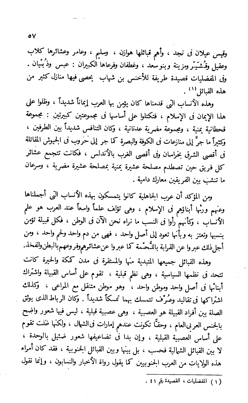 وهذه القبائل جميعها المتبدية منها والمستقرة فى مدن كمكة والحيرة كانت تتحد فى نظمها السياسية، وهى نظم قبلية، تقوم على أساس القبيلة واشتراك أبنائها فى أصل واحد وموطن واحد، وهو موطن متنقل مع المراعى، وكذلك اشتراكها فى تقاليد وعرف تتمسك بهما تمسكا شديدا. وكان الرباط الذى يوثق الصلة بين أفراد القبيلة هو العصبية، وهى عصبية قبلية، ليس فيها شعور واضح بالجنس العربى العام، وحقّا تكونت عندهم إمارات فى الشمال، ولكنها ظلت تقوم على أساس العصبية القبلية، وإن بدا فى تضاعيفها شعور ضئيل بالوحدة، لا بين القبائل الشمالية فحسب، بل بينها وبين القبائل الجنوبية، فقد كان أمراء هذه الولايات من العرب الجنوبيين كما يقول رواة الأخبار والنسابون، وإنما نقول