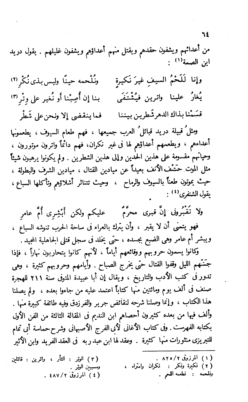 ومثل قبيلة دريد قبائل العرب جميعها، فهم طعام السيوف، يطعمونها أعداءهم، ويطعمهم أعداؤهم لها فى غير نكران، فهم دائما واترون موتورون، وحياتهم مقسومة على هذين الحدين وإلى هذين الشطرين. ولم يكونوا يرهبون شيئا مثل الموت حتف الأنف بعيدا عن ميادين القتال، ميادين الشرف والبطولة، حيث يموتون طعنا بالسيوف والرماح، وحيث تتناثر أشلاؤهم وتأكلها السباع، يقول الشنفرى (¬4):