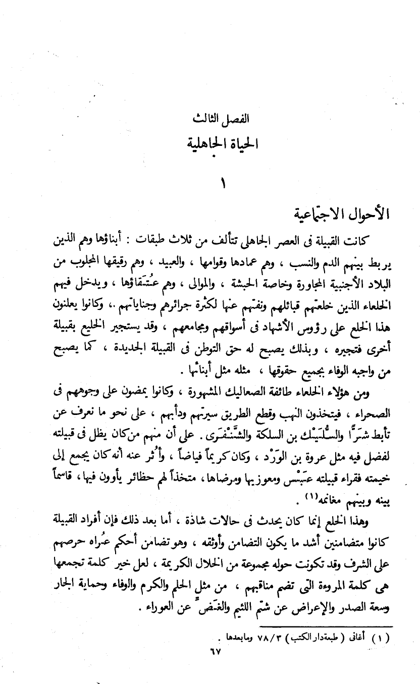 كانت القبيلة فى العصر الجاهلى تتألف من ثلاث طبقات: أبناؤها وهم الذين يربط بينهم الدم والنسب وهم عمادها وقوامها، والعبيد وهم رقيقها المجلوب من البلاد الأجنبية المجاورة وخاصة الحبشة، والموالى وهم عتقاؤها، ويدخل فيهم الخلعاء الذين خلعتهم قبائلهم ونفتهم عنها لكثرة جرائرهم وجناياتهم. وكانوا يعلنون هذا الخلع على رؤوس الأشهاد فى أسواقهم ومجامعهم، وقد يستجير الخليع بقبيلة أخرى فتجيره، وبذلك يصبح له حق التوطن فى القبيلة الجديدة، كما يصبح من واجبه الوفاء بجميع حقوقها مثله مثل أبنائها.