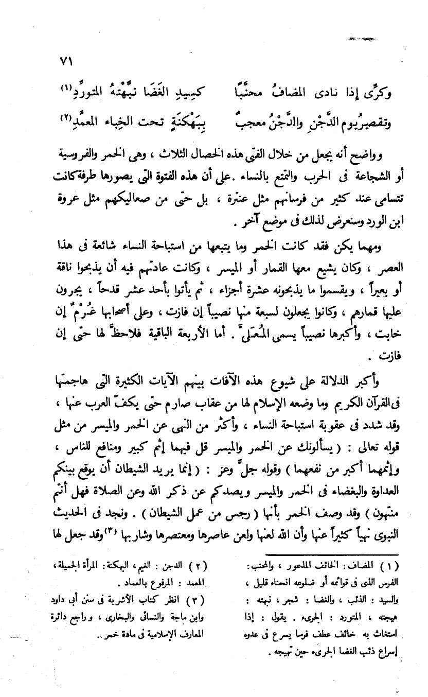 وأكبر الدلالة على شيوع هذه الآفات بينهم الآيات الكثيرة التى هاجمتها فى القرآن الكريم وما وضعه الإسلام لها من عقاب صارم حتى يكف العرب عنها، وقد شدد فى عقوبة استباحة النساء، وأكثر من النهى عن الخمر والميسر من مثل قوله تعالى: {يَسْئَلُونَكَ عَنِ الْخَمْرِ وَالْمَيْسِرِ قُلْ فِيهِما إِثْمٌ كَبِيرٌ وَمَنافِعُ لِلنّاسِ، وَإِثْمُهُما أَكْبَرُ مِنْ نَفْعِهِما»} وقوله جل وعز: {إِنَّما يُرِيدُ الشَّيْطانُ أَنْ يُوقِعَ بَيْنَكُمُ الْعَداوَةَ وَالْبَغْضاءَ فِي الْخَمْرِ وَالْمَيْسِرِ وَيَصُدَّكُمْ عَنْ ذِكْرِ اللهِ وَعَنِ الصَّلاةِ فَهَلْ أَنْتُمْ مُنْتَهُونَ»} وقد وصف الخمر بأنها «رجس من عمل الشيطان». ونجد فى الحديث النبوى نهيا كثيرا عنها وأن الله لعنها ولعن عاصرها ومعتصرها وشاربها (¬3) وقد جعل لها