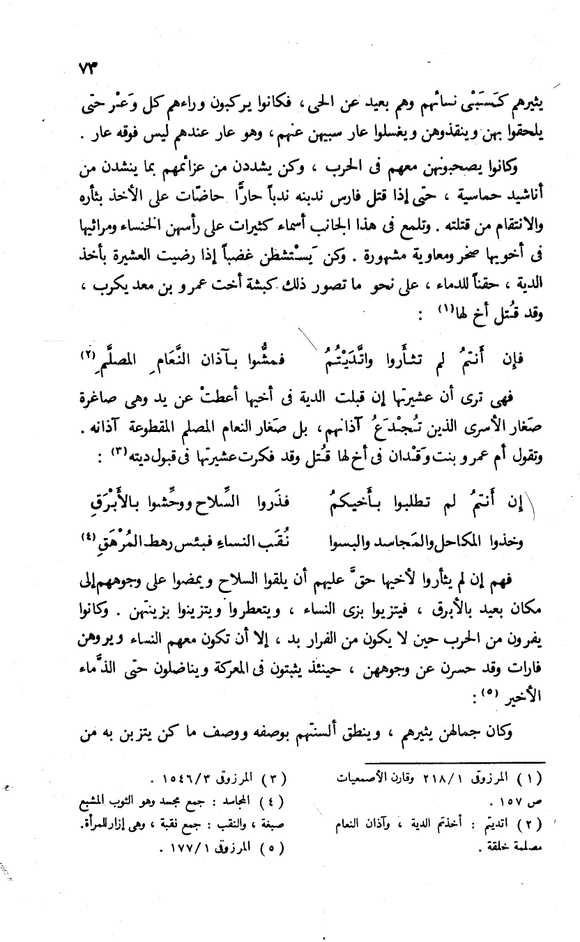 فهم إن لم يثأروا لأخيها حقّ عليهم أن يلقوا السلاح ويمضوا على وجوههم إلى مكان بعيد بالأبرق، فيتزيوا بزى النساء، ويتعطروا ويتزينوا بزينتهن. وكانوا يفرون من الحرب حين لا يكون من الفرار بد، إلا أن تكون معهم النساء ويرونهن فارات وقد حسرن عن وجوههن، حينئذ يثبتون فى المعركة ويناضلون حتى الذماء الأخير (¬5).