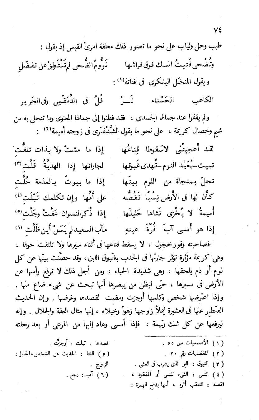 ولم يقفوا عند جمالها الجسدى، فقد فطنوا إلى جمالها المعنوى وما تتحلى به من شيم وخصال كريمة، على نحو ما يقول الشّنفرى فى زوجه أميمة (¬2):