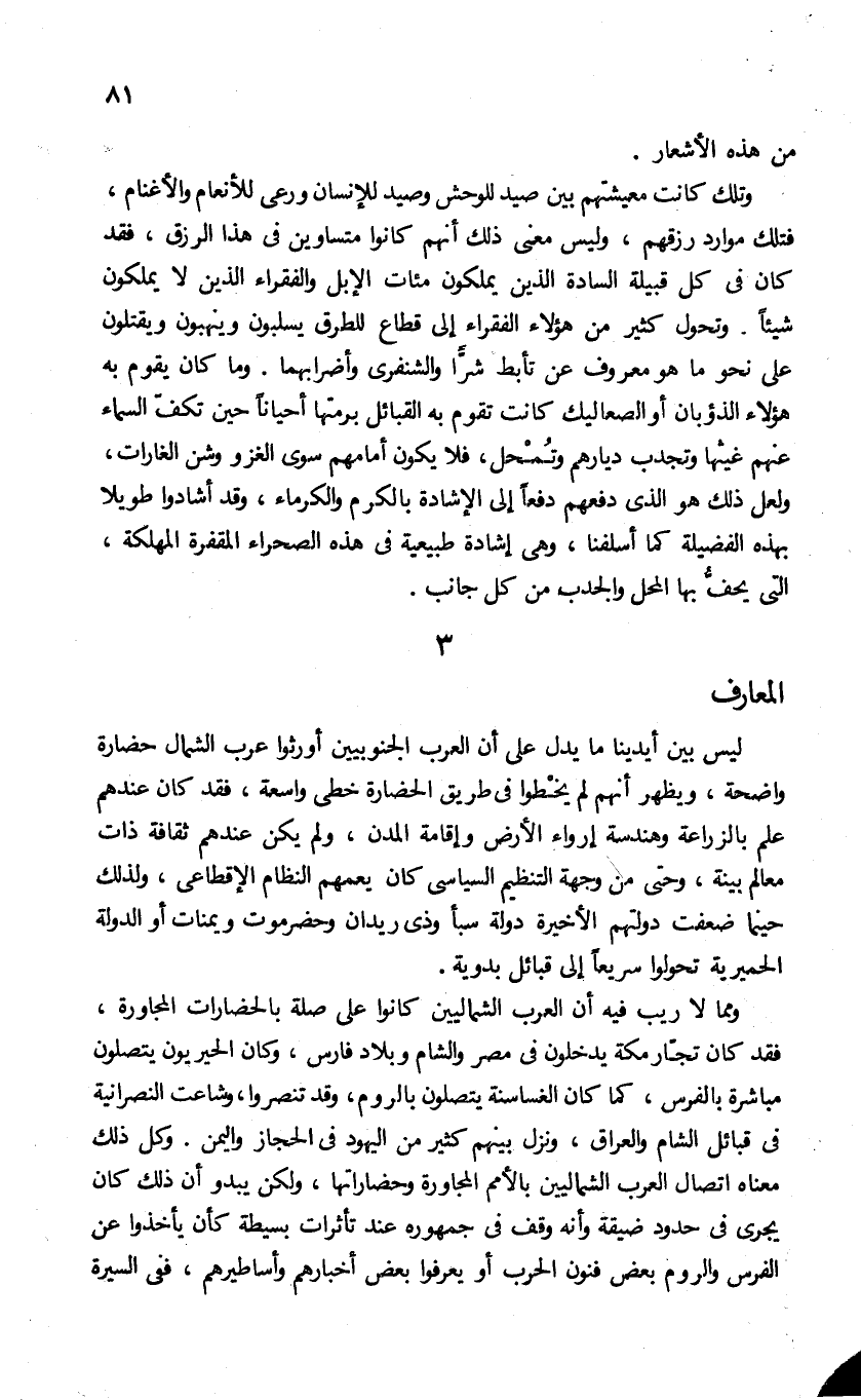 وتلك كانت معيشتهم بين صيد للوحش وصيد للإنسان ورعى للأنعام والأغنام، فتلك موارد رزقهم، وليس معنى ذلك أنهم كانوا متساوين فى هذا الرزق، فقد كان فى كل قبيلة السادة الذين يملكون مئات الإبل والفقراء الذين لا يملكون شيئا. وتحول كثير من هؤلاء الفقراء إلى قطاع للطرق يسلبون وينهبون ويقتلون على نحو ما هو معروف عن تأبط شرا والشنفرى وأضرابهما. وما كان يقوم به هؤلاء الذؤبان أو الصعاليك كانت تقوم به القبائل برمتها أحيانا حين تكفّ السماء عنهم غيثها وتجدب ديارهم وتمحل، فلا يكون أمامهم سوى الغزو وشن الغارات، ولعل ذلك هو الذى دفعهم دفعا إلى الإشادة بالكرم والكرماء، وقد أشادوا طويلا بهذه الفضيلة كما أسلفنا، وهى إشادة طبيعية فى هذه الصحراء المقفرة المهلكة، التى يحفّ بها المحل والجدب من كل جانب.