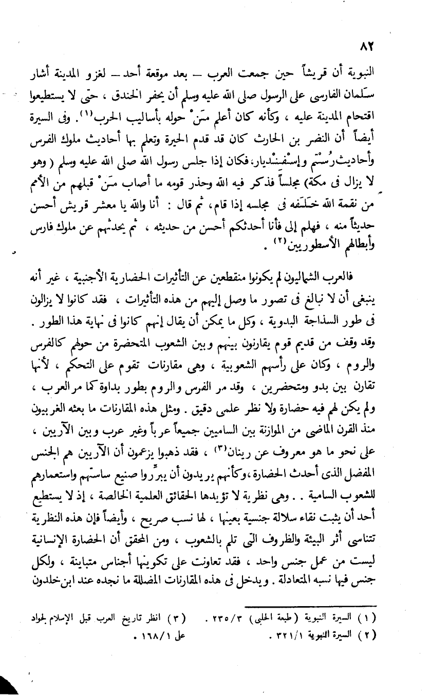 وقد وقف من قديم قوم يقارنون بينهم وبين الشعوب المتحضرة من حولهم كالفرس والروم، وكان على رأسهم الشعوبية، وهى مقارنات تقوم على التحكم. لأنها تقارن بين بدو ومتحضرين، وقد مر الفرس والروم بطور بداوة كما مر العرب، ولم يكن لهم فيه حضارة ولا نظر علمى دقيق. ومثل هذه المقارنات ما بعثه الغربيون منذ القرن الماضى من الموازنة بين الساميين جميعا عربا وغير عرب وبين الآريين، على نحو ما هو معروف عن رينان (¬3)، فقد ذهبوا يزعمون أن الآريين هم الجنس المفضل الذى أحدث الحضارة، وكأنهم يريدون أن يبرروا صنيع ساستهم واستعمارهم للشعوب السامية. . وهى نظرية لا تؤيدها الحقائق العلمية الخالصة، إذ لا يستطيع أحد أن يثبت نقاء سلالة جنسية بعينها، لها نسب صريح، وأيضا فإن هذه النظرية تتناسى أثر البيئة والظروف التى تلم بالشعوب، ومن المحقق أن الحضارة الإنسانية ليست من عمل جنس واحد، فقد تعاونت على تكوينها أجناس متباينة، ولكل جنس فيها نسبه المتعادلة. ويدخل فى هذه المقارنات المضللة ما نجده عند ابن خلدون من حكمه على العرب بأنهم ليسوا أصحاب صناعات ولا علوم (¬4) لأن ذلك