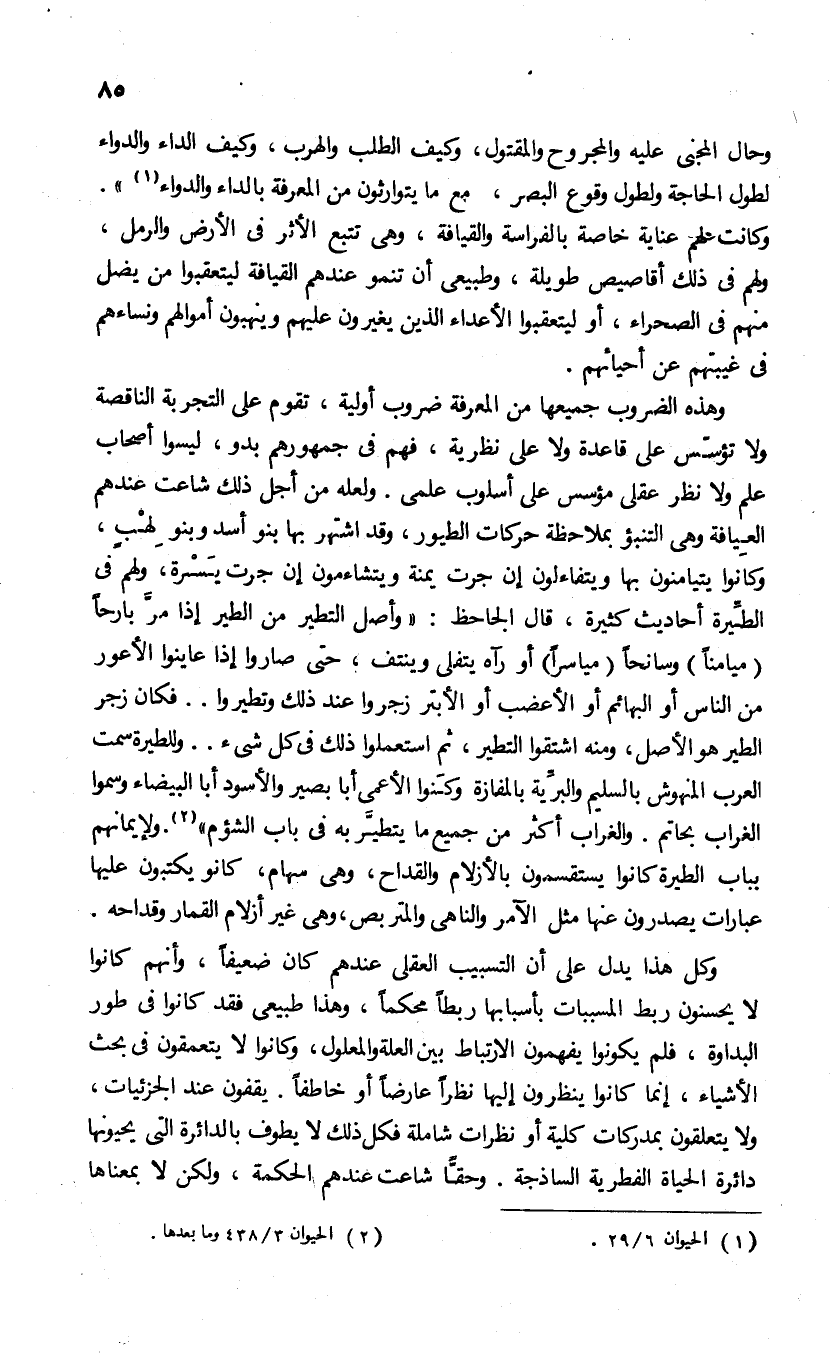 وهذه الضروب جميعها من المعرفة ضروب أولية، تقوم على التجربة الناقصة ولا تؤسّس على قاعدة ولا على نظرية، فهم فى جمهورهم بدو، ليسوا أصحاب علم ولا نظر عقلى مؤسس على أسلوب علمى. ولعله من أجل ذلك شاعت عندهم العيافة وهى التنبؤ بملاحظة حركات الطيور، وقد اشتهر بها بنو أسد وبنو لهب، وكانوا يتيامنون بها ويتفاءلون إن جرت يمنة ويتشاءمون إن جرت يسرة، ولهم فى الطّيرة أحاديث كثيرة، قال الجاحظ: «وأصل التطير من الطير إذا مرّ بارحا (ميامنا) وسانحا (مياسرا) أو رآه يتفلى وينتف، حتى صاروا إذا عاينوا الأعور من الناس أو البهائم أو الأعضب أو الأبتر زجروا عند ذلك وتطيروا. . فكان زجر الطير هو الأصل، ومنه اشتقوا التطير، ثم استعملوا ذلك فى كل شئ. . وللطيرة سمت العرب المنهوش بالسليم والبرية بالمفازة وكنوا الأعمى أبا بصير والأسود أبا البيضاء وسموا الغراب بحاتم. والغراب أكثر من جميع ما يتطيّر به فى باب الشؤم (¬2)».