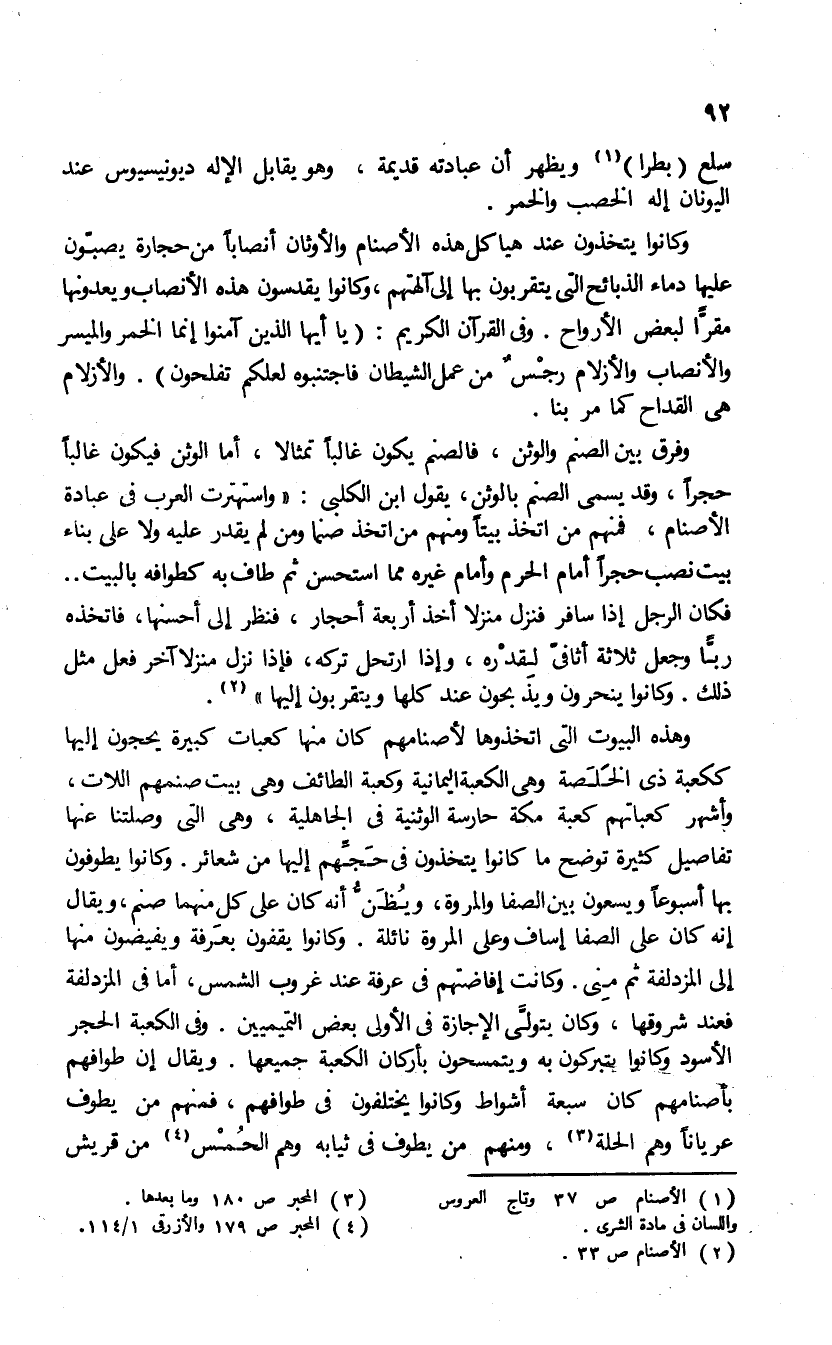 فكان الرجل إذا سافر فنزل منزلا أخذ أربعة أحجار، فنظر إلى أحسنها، فاتخذه ربّا وجعل ثلاثة أثافىّ لقدره. وإذا ارتحل تركه، فإذا نزل منزلا آخر فعل مثل ذلك. وكانوا ينحرون ويذبحون عند كلها ويتقربون إليها (¬2)».
