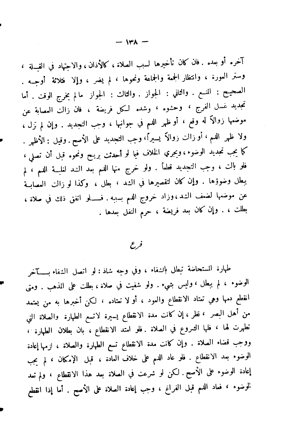 آخِرَهُ أَوْ بَعْدَهُ. فَإِنْ كَانَ تَأْخِيرُهَا لِسَبَبِ الصَّلَاةِ، كَالْأَذَانِ، وَالِاجْتِهَادِ فِي الْقِبْلَةِ، وَسَتْرِ الْعَوْرَةِ، وَانْتِظَارِ الْجُمُعَةِ وَالْجَمَاعَةِ وَنَحْوِهَا، لَمْ يَضُرَّ، وَإِلَّا فَثَلَاثَةُ أَوْجُهٍ. الصَّحِيحُ: الْمَنْعُ. وَالثَّانِي: الْجَوَازُ. وَالثَّالِثُ: الْجَوَازُ مَا لَمْ يَخْرُجِ الْوَقْتُ. أَمَّا تَجْدِيدُ غَسْلِ الْفَرْجِ، وَحَشْوِهِ، وَشَدِّهِ لِكُلِّ فَرِيضَةٍ، فَإِنْ زَالَتِ الْعِصَابَةُ عَنْ مَوْضِعِهَا زَوَالًا لَهُ وَقْعٌ، أَوْ ظَهَرَ الدَّمُ فِي جَوَانِبِهَا، وَجَبَ التَّجْدِيدُ. وَإِنْ لَمْ تَزَلْ، وَلَا ظَهَرَ الدَّمُ، أَوْ زَالَتْ زَوَالًا يَسِيرًا، وَجَبَ التَّجْدِيدُ عَلَى الْأَصَحِّ. وَقِيلَ: الْأَظْهَرُ. كَمَا يَجِبُ تَجْدِيدُ الْوُضُوءِ، وَيَجْرِي الْخِلَافُ فِيمَا لَوْ أَحْدَثَتْ بِرِيحٍ وَنَحْوِهِ قَبْلَ أَنْ تُصَلِّيَ، فَلَوْ بَالَتْ، وَجَبَ التَّجْدِيدُ قَطْعًا. وَلَوْ خَرَجَ مِنْهَا الدَّمُ بَعْدَ الشَّدِّ لِغَلَبَةِ الدَّمِ، لَمْ يَبْطُلْ وُضُوؤُهَا. وَإِنْ كَانَ لِتَقْصِيرِهَا فِي الشَّدِّ، بَطَلَ، وَكَذَا لَوْ زَالَتِ الْعِصَابَةُ عَنْ مَوْضِعِهَا لَضَعْفِ الشَّدِّ، وَزَادَ خُرُوجُ الدَّمِ بِسَبَبِهِ. وَلَوِ اتَّفَقَ ذَلِكَ فِي صَلَاةٍ، بَطَلَتْ، وَإِنْ كَانَ بَعْدَ فَرِيضَةٍ، حَرُمَ النَّفْلُ بَعْدَهَا.