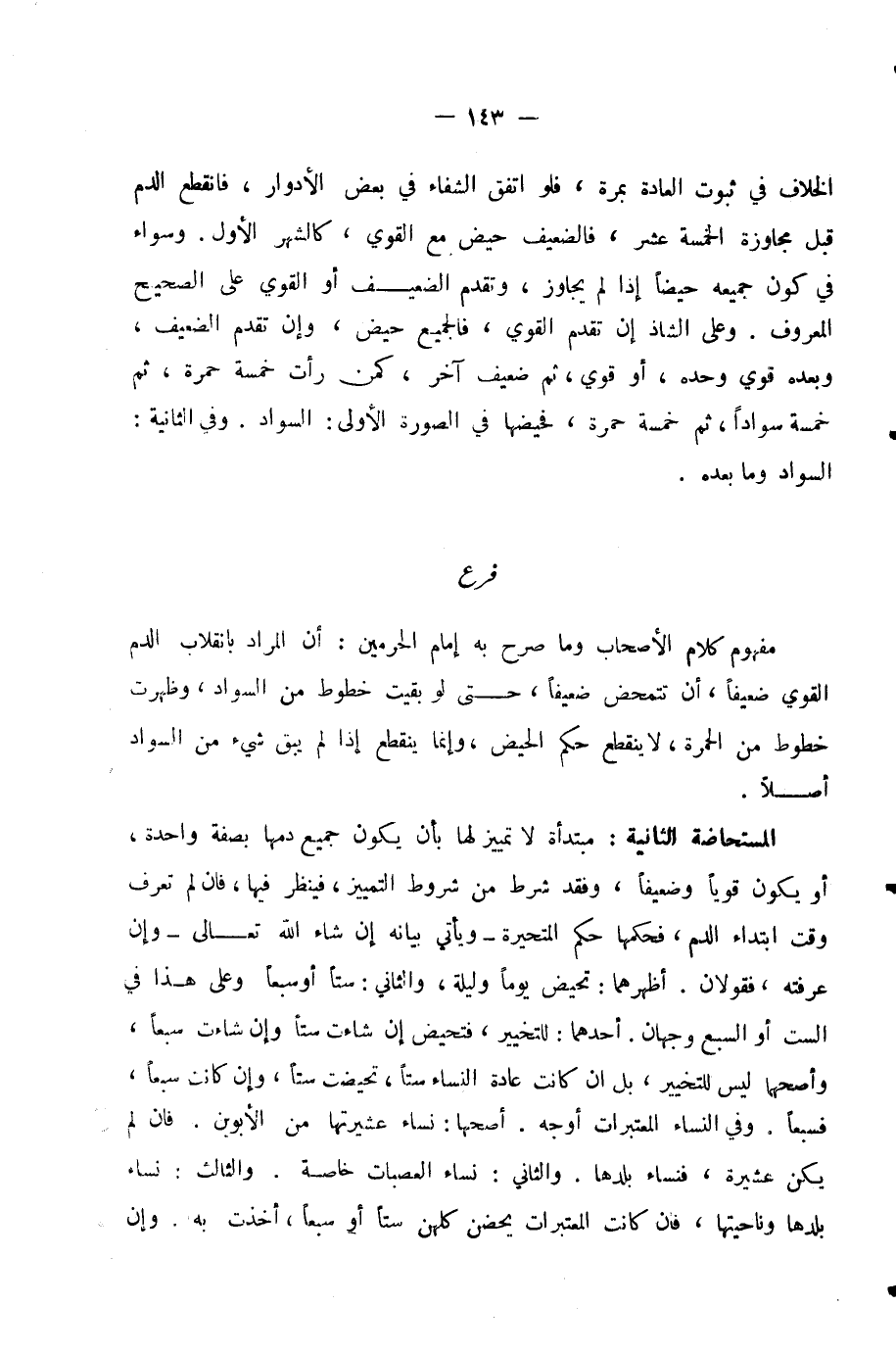 مَفْهُومُ كَلَامِ الْأَصْحَابِ وَمَا صَرَّحَ بِهِ إِمَامُ الْحَرَمَيْنِ: أَنَّ الْمُرَادَ بِانْقِلَابِ الدَّمِ الْقَوِيِّ ضَعِيفًا، أَنْ تَتَمَحَّضَ ضَعِيفًا، حَتَّى لَوْ بَقِيَتْ خُطُوطٌ مِنَ السَّوَادِ، وَظَهَرَتْ خُطُوطٌ مِنَ الْحُمْرَةِ، لَا يَنْقَطِعُ حُكْمُ الْحَيْضِ، وَإِنَّمَا يَنْقَطِعُ إِذَا لَمْ يَبْقَ شَيْءٌ مِنَ السَّوَادِ أَصْلًا.