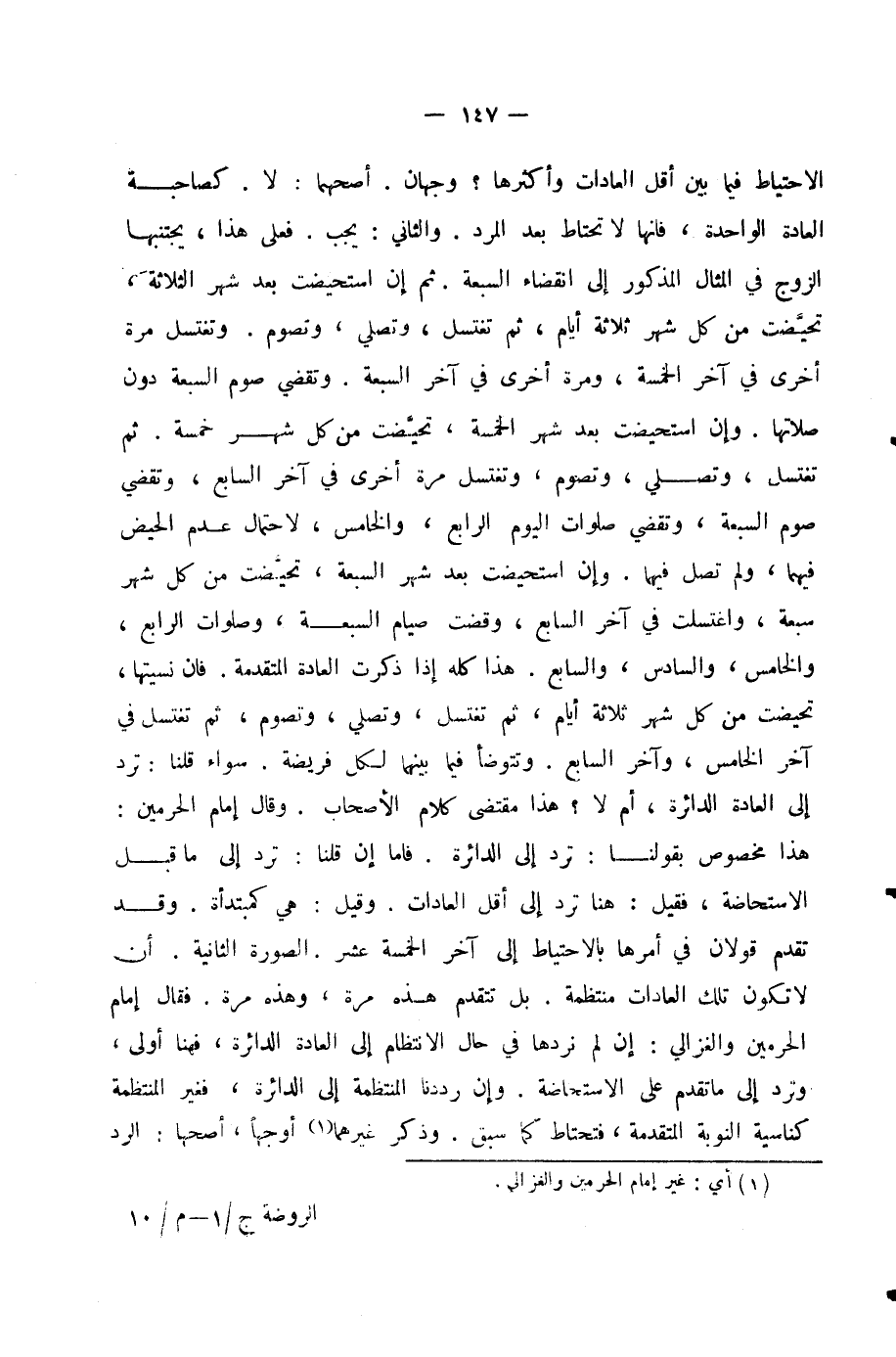وَقَالَ إِمَامُ الْحَرَمَيْنِ: هَذَا مَخْصُوصٌ بِقَوْلِنَا: تَرُدُّ إِلَى الدَّائِرَةِ فَأَمَّا إِنْ قُلْنَا: تَرُدُّ إِلَى مَا قَبْلَ الِاسْتِحَاضَةِ، فَقِيلَ: هُنَا تَرُدُّ إِلَى أَقَلِّ الْعَادَاتِ. وَقِيلَ: هِيَ كَمُبْتَدَأَةٍ. وَقَدْ تَقَدَّمَ قَوْلَانِ فِي أَمْرِهَا بِالِاحْتِيَاطِ إِلَى آخِرِ الْخَمْسَةَ عَشَرَ.
