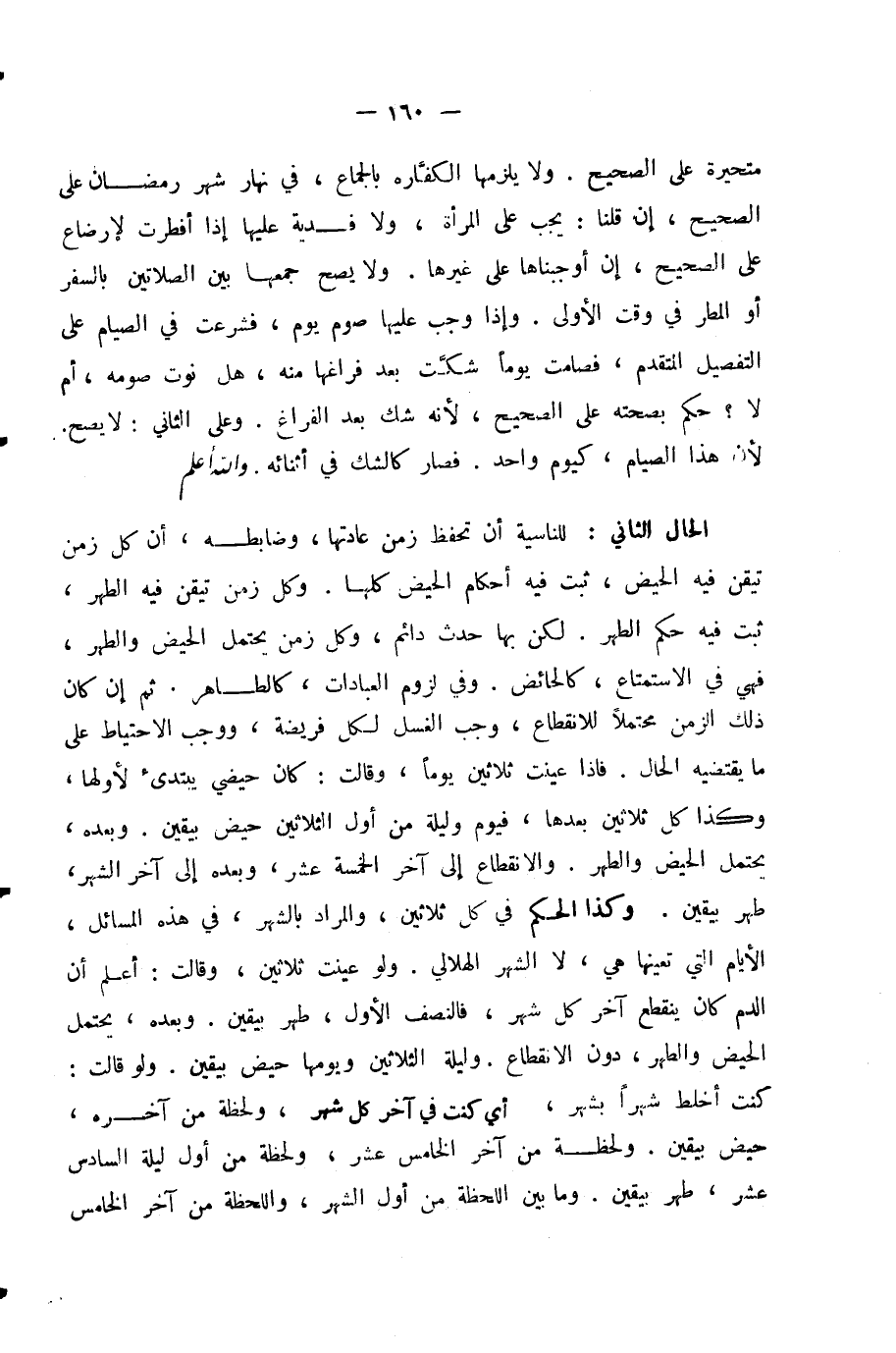 وَالِانْقِطَاعُ إِلَى آخِرِ الْخَمْسَةَ عَشَرَ، وَبَعْدَهُ إِلَى آخِرِ الشَّهْرِ، طُهْرٌ بِيَقِينٍ. وَكَذَا الْحُكْمُ فِي كُلِّ ثَلَاثِينَ، وَالْمُرَادُ بِالشَّهْرِ فِي هَذِهِ الْمَسَائِلِ الْأَيَّامُ الَّتِي تُعَيِّنُهَا هِيَ، لَا الشَّهْرُ الْهِلَالِيُّ. وَلَوْ عَيَّنَتْ ثَلَاثِينَ، وَقَالَتْ: أَعْلَمُ أَنَّ الدَّمَ كَانَ يَنْقَطِعُ آخِرَ كُلِّ شَهْرٍ، فَالنِّصْفُ الْأَوَّلُ طُهْرٌ بِيَقِينٍ. وَبَعْدَهُ يَحْتَمِلُ الْحَيْضَ وَالطُّهْرَ دُونَ الِانْقِطَاعِ. وَلَيْلَةُ الثَّلَاثِينَ وَيَوْمُهَا حَيْضٌ بِيَقِينٍ.
