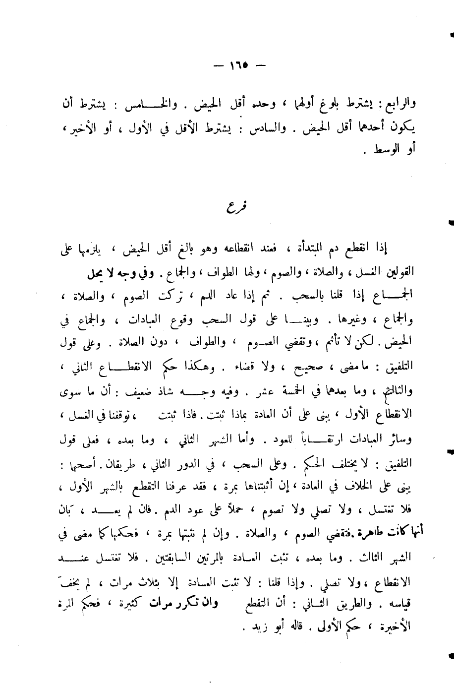 وَالرَّابِعُ: يُشْتَرَطُ بُلُوغُ أَوَّلِهِمَا، وَحَدُّهُ أَقَلُّ الْحَيْضِ. وَالْخَامِسُ: يُشْتَرَطُ أَنْ يَكُونَ أَحَدُهُمَا أَقَلَّ الْحَيْضِ. وَالسَّادِسُ: يُشْتَرَطُ الْأَقَلُّ فِي الْأَوَّلِ أَوِ الْأَخِيرِ أَوِ الْوَسَطِ.