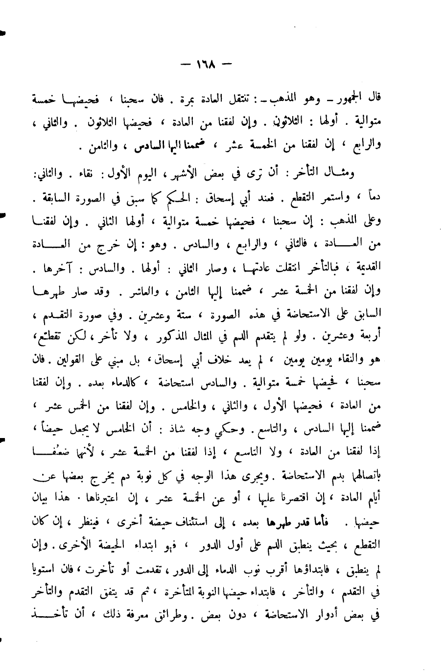 وَيُجْرَى هَذَا الْوَجْهُ فِي كُلِّ نَوْبَةِ دَمٍ يَخْرُجُ بَعْضُهَا عَنْ أَيَّامِ الْعَادَةِ، إِنِ اقْتَصَرْنَا عَلَيْهَا، أَوْ عَنِ الْخَمْسَةَ عَشَرَ إِنِ اعْتَبَرْنَاهَا. هَذَا بَيَانُ حَيْضِهَا.