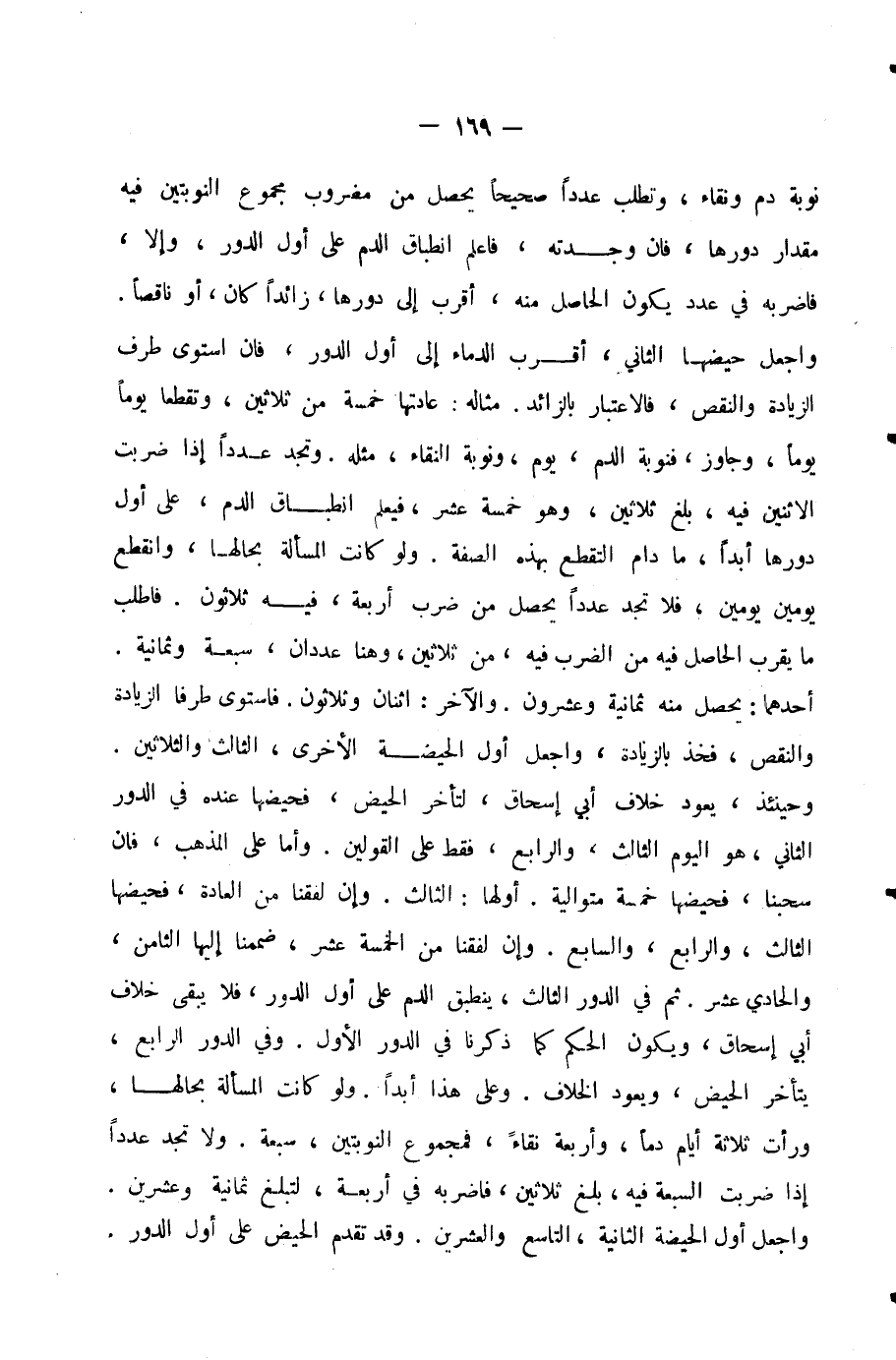 نَوْبَةَ دَمٍ وَنَقَاءٍ، وَتَطْلُبَ عَدَدًا صَحِيحًا يَحْصُلُ مِنْ مَضْرُوبِ مَجْمُوعِ النَّوْبَتَيْنِ فِيهِ مِقْدَارُ دَوْرِهَا، فَإِنْ وَجَدَتْهُ، فَاعْلَمِ انْطِبَاقَ الدَّمِ عَلَى أَوَّلِ الدَّوْرِ، وَإِلَّا، فَاضْرِبْهُ فِي عَدَدٍ يَكُونُ الْحَاصِلُ مِنْهُ أَقْرَبَ إِلَى دَوْرِهَا، زَائِدًا كَانَ أَوْ نَاقِصًا. وَاجْعَلْ حَيْضَهَا الثَّانِي، أَقْرَبَ الدِّمَاءِ إِلَى أَوَّلِ الدَّوْرِ، فَإِنِ اسْتَوَى طَرَفُ الزِّيَادَةِ وَالنَّقْصِ فَالِاعْتِبَارُ بِالزَّائِدِ؛ مِثَالُهُ: عَادَتُهَا خَمْسَةٌ مِنْ ثَلَاثِينَ، وَتَقَطَّعَا يَوْمًا يَوْمًا وَجَاوَزَ، فَنَوْبَةُ الدَّمِ يَوْمٌ، وَنَوْبَةُ النَّقَاءِ مِثْلُهُ. وَتَجِدُ عَدَدًا إِذَا ضَرَبْتَ الِاثْنَيْنِ فِيهِ بَلَغَ ثَلَاثِينَ، وَهُوَ خَمْسَةَ عَشَرَ، فَيُعْلَمُ انْطِبَاقُ الدَّمِ، عَلَى أَوَّلِ دَوْرِهَا أَبَدًا، مَا دَامَ التَّقَطُّعُ بِهَذِهِ الصِّفَةِ.