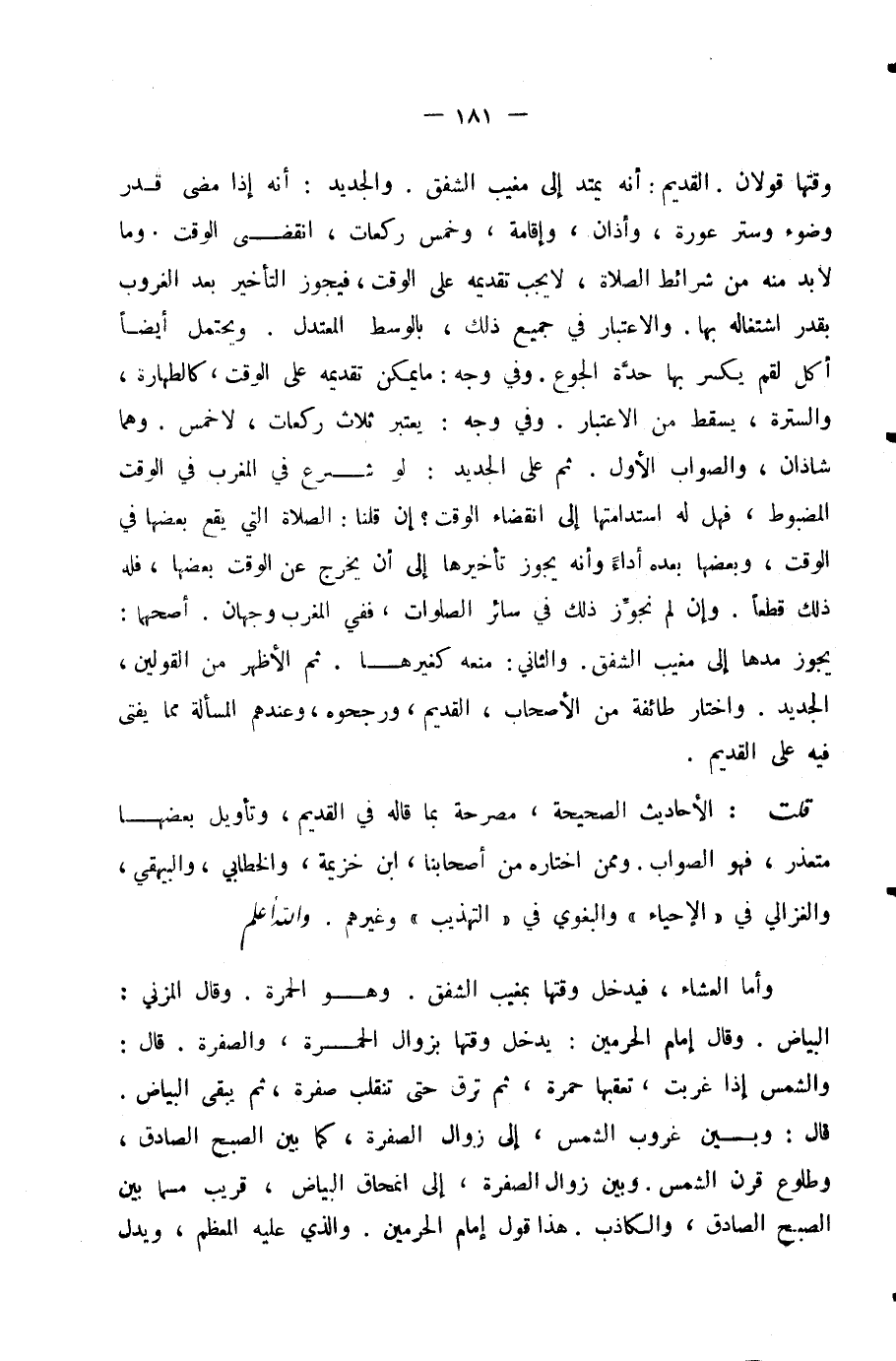 وَقَالَ إِمَامُ الْحَرَمَيْنِ: يَدْخُلُ وَقْتُهَا بِزَوَالِ الْحُمْرَةِ وَالصُّفْرَةِ. قَالَ: وَالشَّمْسُ إِذَا غَرَبَتْ، تَعْقُبُهَا حُمْرَةٌ، ثُمَّ تَرِقُّ حَتَّى تَنْقَلِبَ صُفْرَةً، ثُمَّ يَبْقَى الْبَيَاضُ. قَالَ: وَبَيْنَ غُرُوبِ الشَّمْسِ، إِلَى زَوَالِ الصُّفْرَةِ، كَمَا بَيْنَ الصُّبْحِ الصَّادِقِ، وَطُلُوعِ قَرْنِ الشَّمْسِ. وَبَيْنَ زَوَالِ الصُّفْرَةِ، إِلَى انْمِحَاقِ الْبَيَاضِ، قَرِيبٌ مِمَّا بَيْنُ الصُّبْحِ الصَّادِقِ، وَالْكَاذِبِ. هَذَا قَوْلُ إِمَامِ الْحَرَمَيْنِ. وَالَّذِي عَلَيْهِ الْمُعْظَمُ، وَيَدُلُّ