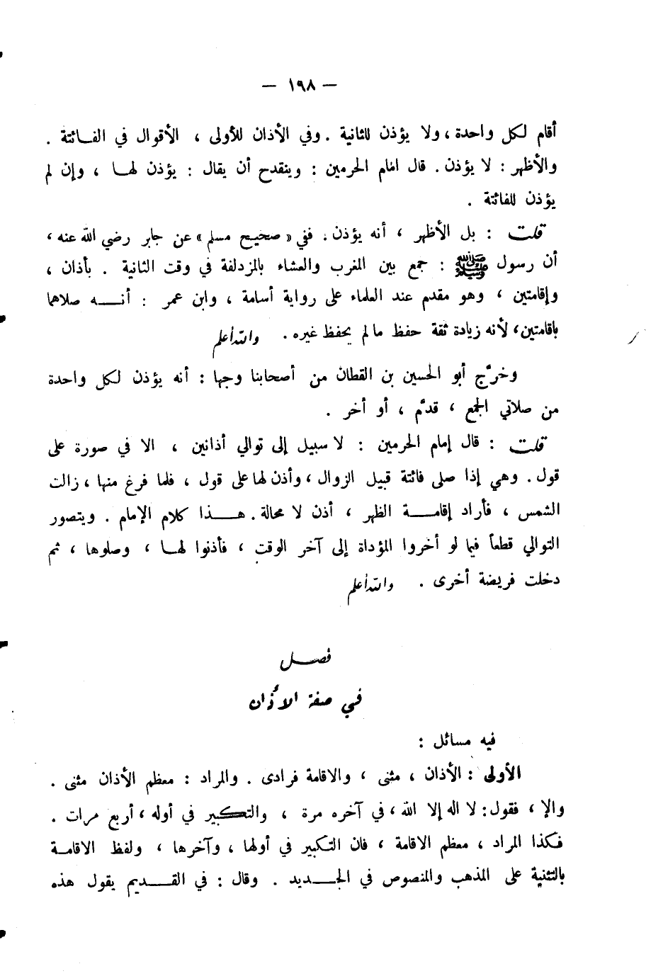 قُلْتُ: بَلِ الْأَظْهَرُ، أَنَّهُ يُؤَذِّنُ. فَفِي (صَحِيحِ مُسْلِمٍ) عَنْ جَابِرٍ رَضِيَ اللَّهُ عَنْهُ، أَنَّ رَسُولَ اللَّهِ صَلَّى اللَّهُ عَلَيْهِ وَسَلَّمَ: جَمَعَ بَيْنَ الْمَغْرِبِ وَالْعِشَاءِ بِالْمُزْدَلِفَةِ فِي وَقْتِ الثَّانِيَةِ. بِأَذَانٍ وَإِقَامَتَيْنِ، وَهُوَ مُقَدَّمٌ عِنْدَ الْعُلَمَاءِ عَلَى رِوَايَةِ أُسَامَةَ، وَابْنِ عُمَرَ: أَنَّهُ صَلَّاهُمَا بِإِقَامَتَيْنِ؛ لِأَنَّهُ زِيَادَةُ ثِقَةِ حَفِظَ مَا لَمْ يَحْفَظْ غَيْرَهُ. وَاللَّهُ أَعْلَمُ.