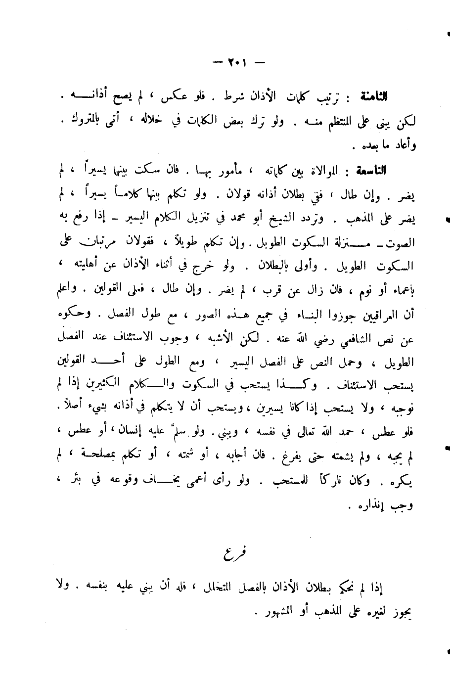 الثَّامِنَةُ: تَرْتِيبُ كَلِمَاتِ الْأَذَانِ شَرْطٌ فَلَوْ عَكَسَ لَمْ يَصِحَّ أَذَانُهُ. لَكِنْ يُبْنَى عَلَى الْمُنْتَظِمِ مِنْهُ، وَلَوْ تَرَكَ بَعْضَ الْكَلِمَاتِ فِي خِلَالِهِ، أَتَى بِالْمَتْرُوكِ، وَأَعَادَ مَا بَعْدَهُ.