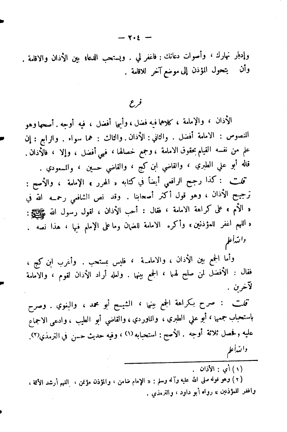 قُلْتُ: كَذَا رَجَّحَ الرَّافِعِيُّ أَيْضًا فِي كِتَابِهِ (الْمُحَرَّرِ) الْإِمَامَةَ، وَالْأَصَحُّ: تَرْجِيحُ الْأَذَانِ، وَهُوَ قَوْلُ أَكْثَرِ أَصْحَابِنَا، وَقَدْ نَصَّ الشَّافِعِيُّ رَحِمَهُ اللَّهُ فِي (الْأُمِّ) عَلَى كَرَاهَةِ الْإِمَامَةِ، فَقَالَ: أُحِبُّ الْأَذَانَ، لِقَوْلِ رَسُولِ اللَّهِ صَلَّى اللَّهُ عَلَيْهِ وَسَلَّمَ: (اللَّهُمَّ اغْفِرْ لِلْمُؤَذِّنِينَ) وَأَكْرَهُ الْإِمَامَةَ لِلضَّمَانِ وَمَا عَلَى الْإِمَامِ فِيهَا، هَذَا نَصُّهُ. وَاللَّهُ أَعْلَمُ.