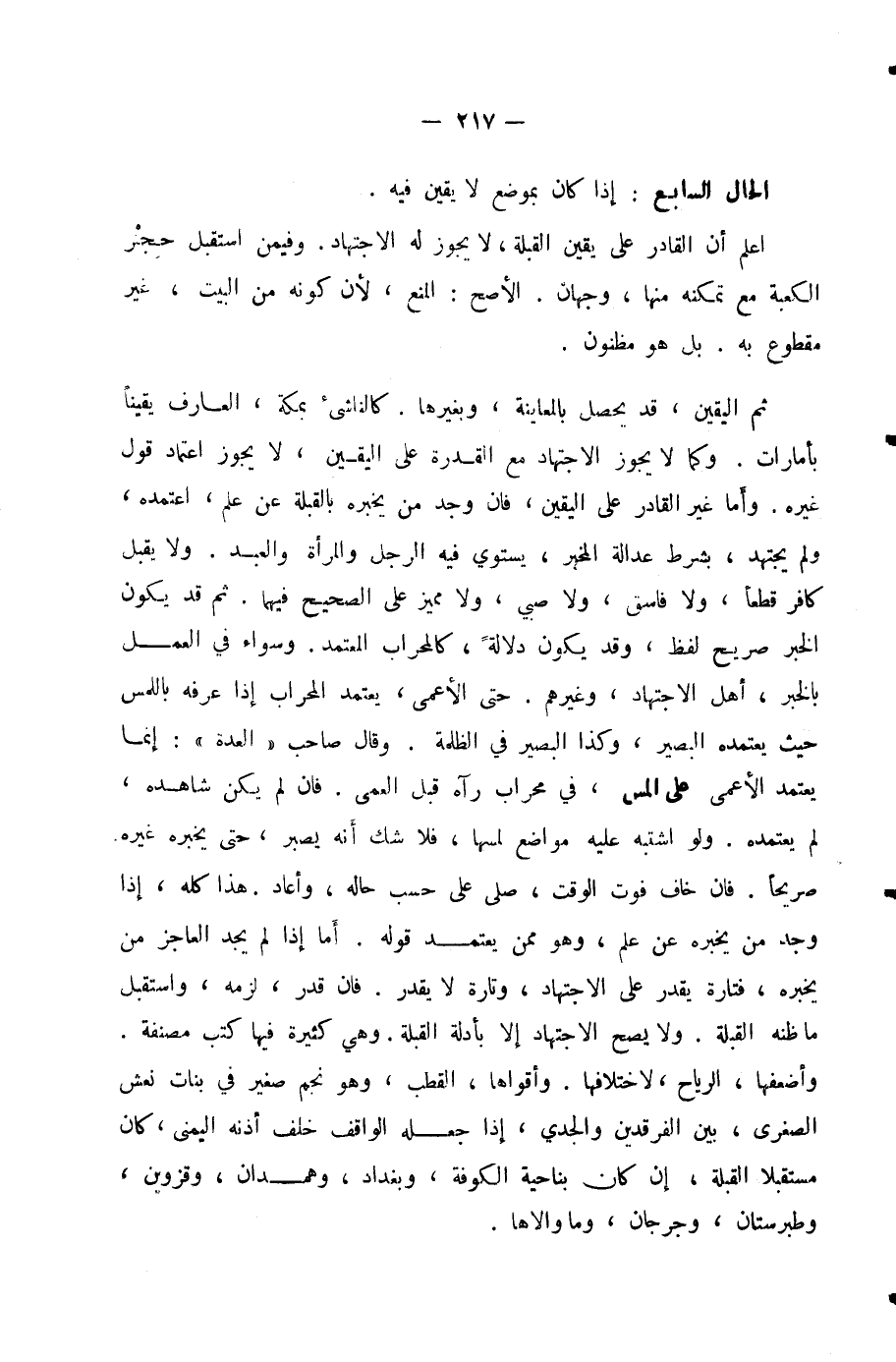 اعْلَمْ أَنَّ الْقَادِرَ عَلَى يَقِينِ الْقِبْلَةِ، لَا يَجُوزُ لَهُ الِاجْتِهَادُ، وَفِيمَنِ اسْتَقْبَلَ حَجَرَ الْكَعْبَةِ مَعَ تَمَكُّنِهِ مِنْهَا، وَجْهَانِ: