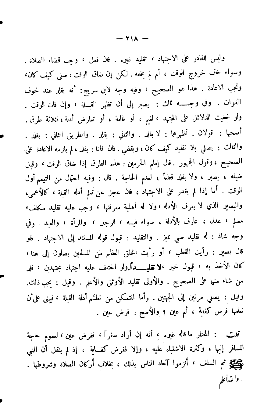 قَالَ إِمَامُ الْحَرَمَيْنِ: هَذِهِ الطُّرُقُ إِذَا ضَاقَ الْوَقْتُ، وَقَبْلَ ضِيقِهِ، يَصْبِرُ، وَلَا يُقَلِّدُ قَطْعًا، لِعَدَمِ الْحَاجَةِ. قَالَ: وَفِيهِ احْتِمَالٌ مِنَ التَّيَمُّمِ أَوَّلَ الْوَقْتِ. أَمَّا إِذَا لَمْ يَقْدِرْ عَلَى الِاجْتِهَادِ، فَإِنْ عَجَزَ عَنْ تَعَلُّمِ أَدِلَّةِ الْقِبْلَةِ، كَالْأَعْمَى وَالْبَصِيرِ الَّذِي لَا يَعْرِفُ الْأَدِلَّةَ، وَلَا لَهُ أَهْلِيَّةُ مَعْرِفَتِهَا، وَجَبَ عَلَيْهِ تَقْلِيدُ مُكَلَّفٍ مُسْلِمٍ عَدْلٍ عَارِفٍ بِالْأَدِلَّةِ، سَوَاءٌ فِيهِ الرَّجُلُ وَالْمَرْأَةُ وَالْعَبْدُ.