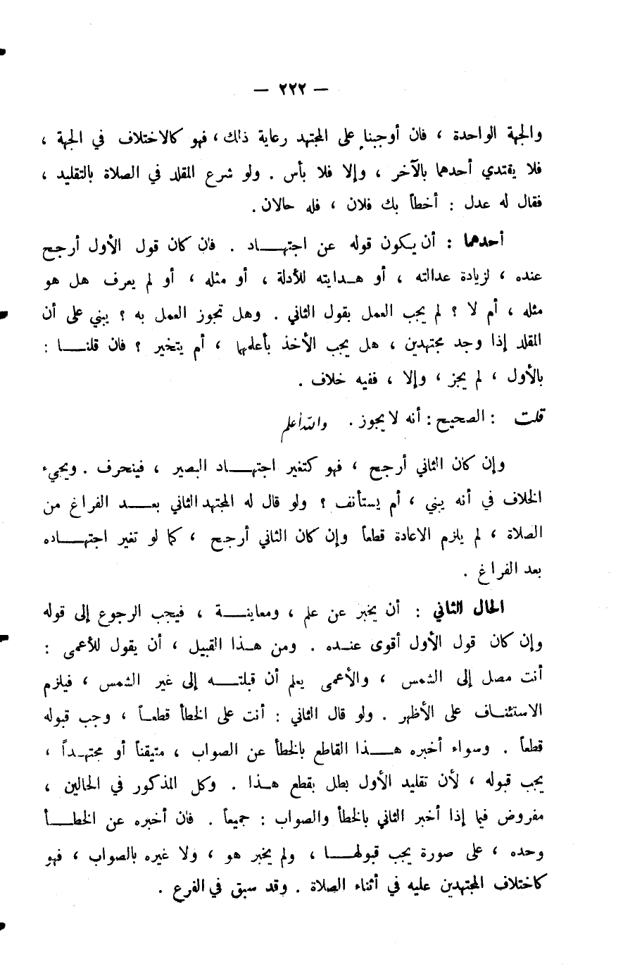 وَكُلُّ الْمَذْكُورِ فِي الْحَالَيْنِ، مَفْرُوضٌ فِيمَا إِذَا أَخْبَرَ الثَّانِي بِالْخَطَأِ وَالصَّوَابِ جَمِيعًا. فَإِنْ أَخْبَرَهُ عَنِ الْخَطَأِ وَحْدَهُ، عَلَى صُورَةٍ يَجِبُ قَبُولُهَا، وَلَمْ يُخْبِرْ هُوَ وَلَا غَيْرُهُ بِالصَّوَابِ، فَهُوَ كَاخْتِلَافِ الْمُجْتَهِدِينَ عَلَيْهِ فِي أَثْنَاءِ الصَّلَاةِ، وَقَدْ سَبَقَ فِي الْفَرْعِ.