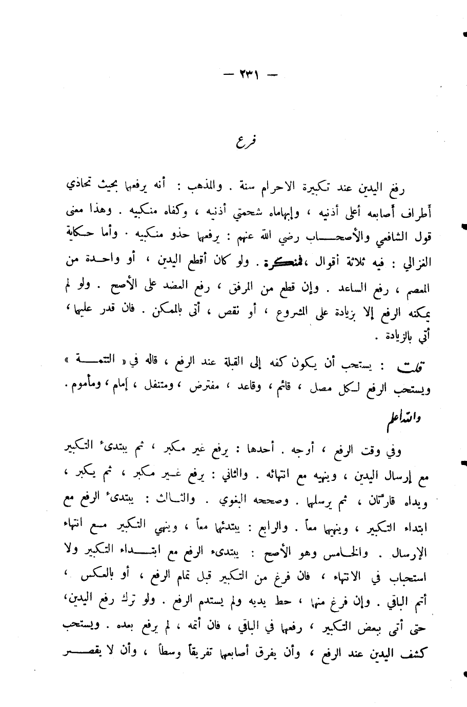 قُلْتُ: يُسْتَحَبُّ أَنْ يَكُونَ كَفُّهُ إِلَى الْقِبْلَةِ عِنْدَ الرَّفْعِ، قَالَهُ فِي (التَّتِمَّةِ) وَيُسْتَحَبُّ الرَّفْعُ لِكُلِّ مُصَلٍّ قَائِمٍ وَقَاعِدٍ، مُفْتَرَضٍ وَمُتَنَفِّلٍ، إِمَامٍ وَمَأْمُومٍ. وَاللَّهُ أَعْلَمُ.