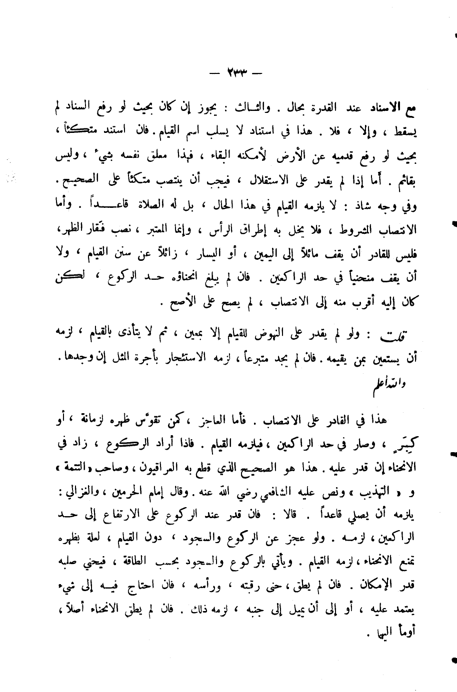 وَفِي وَجْهٍ شَاذٍّ: لَا يَلْزَمُهُ الْقِيَامُ فِي هَذَا الْحَالِ، بَلْ لَهُ الصَّلَاةُ قَاعِدًا، وَأَمَّا الِانْتِصَابُ الْمَشْرُوطُ، فَلَا يُخِلُّ بِهِ إِطْرَاقُ الرَّأْسِ، وَإِنَّمَا الْمُعْتَبَرُ، نَصْبُ فَقَارِ الظَّهْرِ، فَلَيْسَ لِلْقَادِرِ أَنْ يَقِفَ مَائِلًا إِلَى الْيَمِينِ أَوِ الْيَسَارِ، زَائِلًا عَنْ سُنَنِ الْقِيَامِ، وَلَا أَنْ يَقِفَ مُنْحَنِيًا فِي حَدِّ الرَّاكِعِينَ.