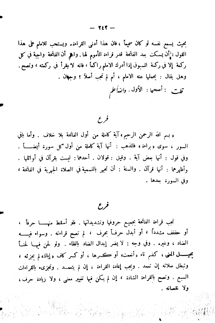 وَاعْلَمْ أَنَّ الْفَاتِحَةَ وَاجِبَةٌ فِي كُلِّ رَكْعَةٍ إِلَّا فِي رَكْعَةِ الْمَسْبُوقِ إِذَا أَدْرَكَ الْإِمَامَ رَاكِعًا فَإِنَّهُ لَا يَقْرَأُ فِي رَكْعَتِهِ وَتَصِحُّ، وَهَلْ يُقَالُ يَحْمِلُهَا عَنْهُ الْإِمَامُ أَمْ لَمْ تَجِبْ أَصْلًا؟ وَجْهَانِ، قُلْتُ أَصَحُّهُمَا الْأَوَّلُ. وَاللَّهُ أَعْلَمُ.