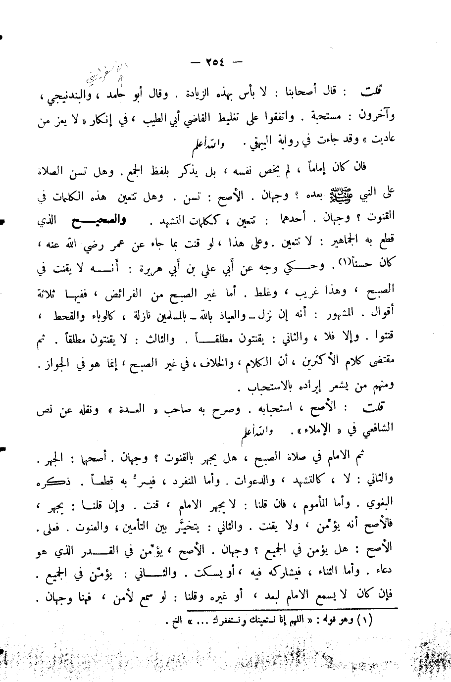 ثُمَّ الْإِمَامُ فِي صَلَاةِ الصُّبْحِ، هَلْ يَجْهَرُ بِالْقُنُوتِ؟ وَجْهَانِ: