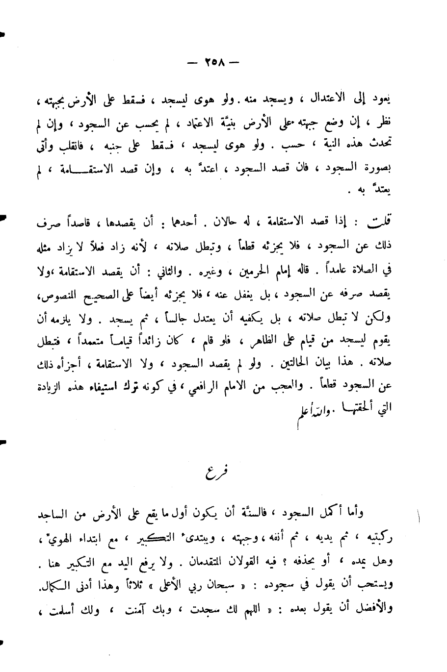 قُلْتُ: إِذَا قَصَدَ الِاسْتِقَامَةَ لَهُ حَالَانِ: أَحَدُهُمَا أَنْ يَقْصِدَهَا قَاصِدًا صَرْفَ ذَلِكَ عَنِ السُّجُودِ فَلَا يُجْزِئُهُ قَطْعًا وَتَبْطُلُ صَلَاتُهُ؛ لِأَنَّهُ زَادَ فِعْلًا لَا يُزَادُ مِثْلُهُ فِي الصَّلَاةِ عَامِدًا. قَالَهُ إِمَامُ الْحَرَمَيْنِ وَغَيْرُهُ.