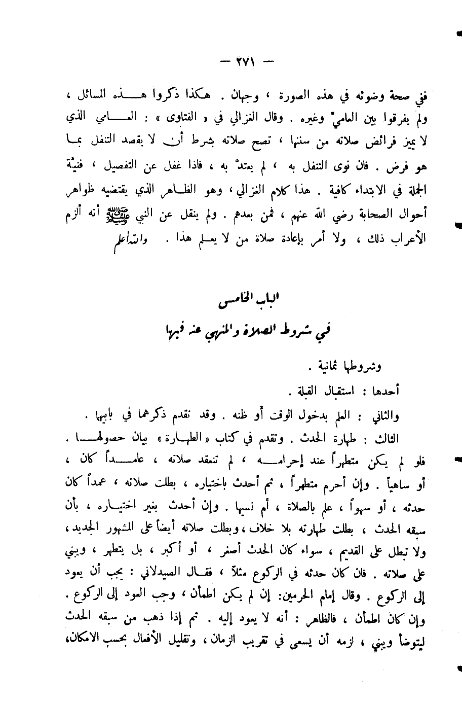 الْبَابُ الْخَامِسُ فِي شُرُوطِ الصَّلَاةِ وَالْمَنْهِيِّ عَنْهُ فِيهَا.