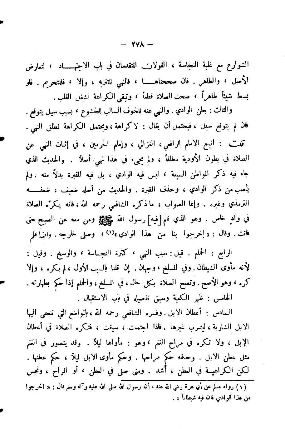 قُلْتُ: اتَّبَعَ الْإِمَامُ الرَّافِعِيُّ الْغَزَالِيَّ وَإِمَامَ الْحَرَمَيْنِ فِي إِثْبَاتِ النَّهْيِ عَنِ الصَّلَاةِ فِي بُطُونِ الْأَوْدِيَةِ مُطْلَقًا، وَلَمْ يَجِئْ فِي هَذَا نَهْيٌ أَصْلًا.