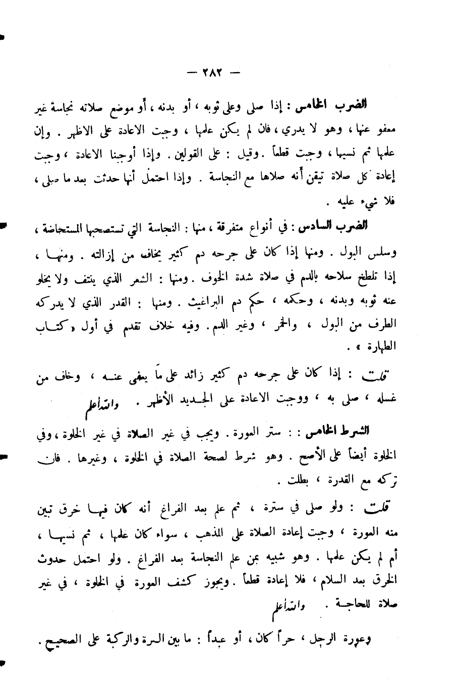 الضَّرْبُ السَّادِسُ: فِي أَنْوَاعٍ مُتَفَرِّقَةٍ، مِنْهَا النَّجَاسَةُ الَّتِي تَسْتَصْحِبُهَا الْمُسْتَحَاضَةُ، وَسَلَسُ الْبَوْلِ، وَمِنْهَا إِذَا كَانَ عَلَى جُرْحِهِ دَمٌ كَثِيرٌ يَخَافُ مِنْ إِزَالَتِهِ.