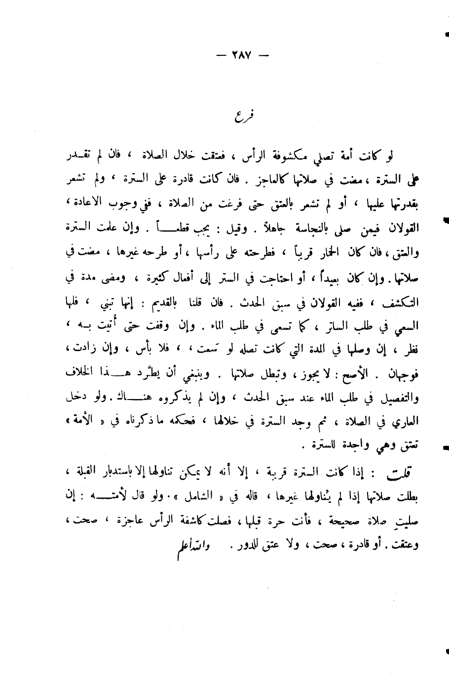 لَوْ كَانَتْ أَمَةً تُصَلِّي مَكْشُوفَةَ الرَّأْسِ، فَعَتَقَتْ خِلَالَ الصَّلَاةِ، فَإِنْ لَمْ تَقْدِرْ عَلَى السُّتْرَةِ، مَضَتْ فِي صَلَاتِهَا كَالْعَاجِزِ.