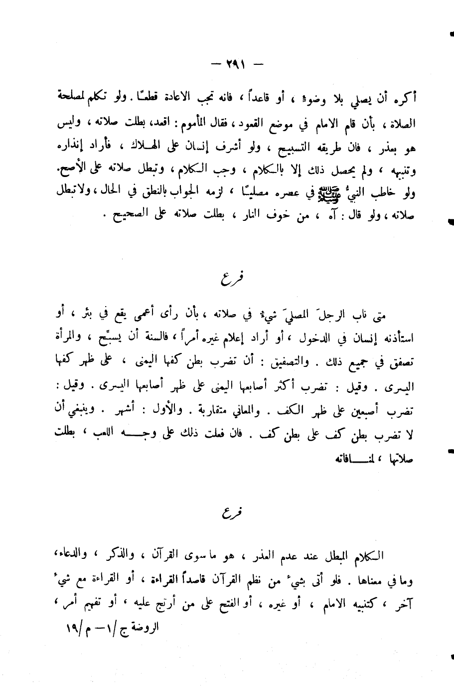 أَكْرَهُ أَنْ يُصَلِّيَ بِلَا وُضُوءٍ أَوْ قَاعِدًا فَإِنَّهُ تَجِبُ الْإِعَادَةُ قَطْعًا. وَلَوْ تَكَلَّمَ لِمَصْلَحَةِ الصَّلَاةِ، بِأَنْ قَامَ الْإِمَامُ فِي مَوْضِعِ الْقُعُودِ، فَقَالَ الْمَأْمُومُ: اقْعُدْ بَطَلَتْ صَلَاتُهُ وَلَيْسَ هُوَ بِعُذْرٍ، فَإِنَّ طَرِيقَهُ التَّسْبِيحُ، وَلَوْ أَشْرَفَ إِنْسَانٌ عَلَى الْهَلَاكِ، فَأَرَادَ إِنْذَارَهُ وَتَنْبِيهَهُ، وَلَمْ يَحْصُلْ ذَلِكَ إِلَّا بِالْكَلَامِ وَجَبَ الْكَلَامُ وَتَبْطُلُ صَلَاتُهُ عَلَى الْأَصَحِّ. وَلَوْ خَاطَبَ النَّبِيُّ صَلَّى اللَّهُ عَلَيْهِ وَسَلَّمَ فِي عَصْرِهِ مُصَلِّيًا لَزِمَهُ الْجَوَابُ بِالنُّطْقِ فِي الْحَالِ وَلَا تَبْطُلُ صَلَاتُهُ. وَلَوْ قَالَ: «آهٍ» مِنْ خَوْفِ النَّارِ بَطَلَتْ صَلَاتُهُ عَلَى الصَّحِيحِ.