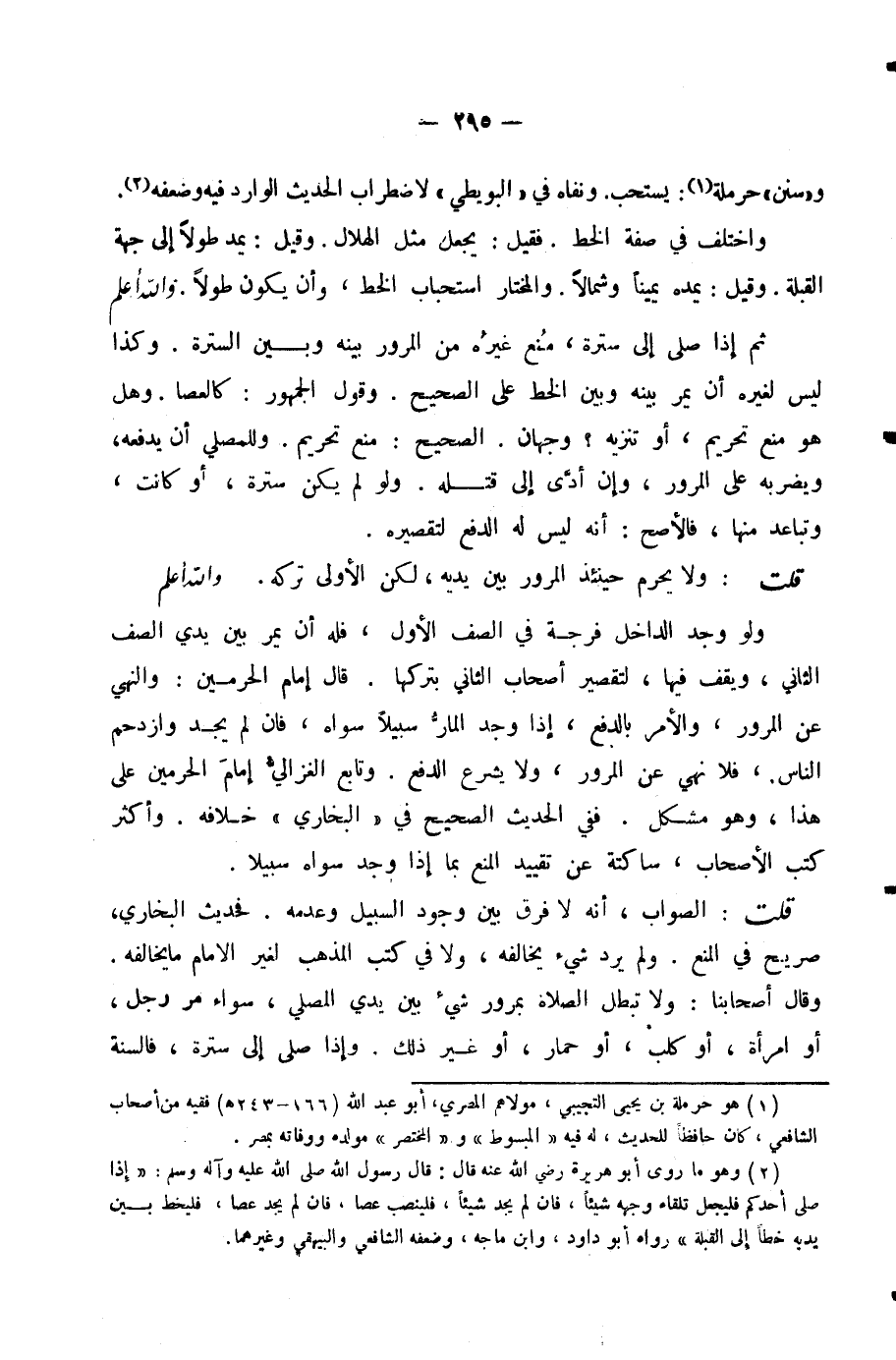 قُلْتُ: الصَّوَابُ أَنَّهُ لَا فَرْقَ بَيْنَ وُجُودِ السَّبِيلِ وَعَدَمِهِ. فَحَدِيثُ الْبُخَارِيِّ صَرِيحٌ فِي الْمَنْعِ. وَلَمْ يَرِدْ شَيْءٌ يُخَالِفُهُ، وَلَا فِي كُتُبِ الْمَذْهَبِ لِغَيْرِ الْإِمَامِ مَا يُخَالِفُهُ. وَقَالَ أَصْحَابُنَا: وَلَا تَبْطُلُ الصَّلَاةُ بِمُرُورِ شَيْءٍ بَيْنَ يَدَيِ الْمُصَلِّي، سَوَاءً مَرَّ رَجُلٌ أَوِ امْرَأَةٌ أَوْ كَلْبٌ أَوْ حِمَارٌ، أَوْ غَيْرُ ذَلِكَ. وَإِذَا صَلَّى إِلَى سُتْرَةٍ فَالسُّنَّةُ