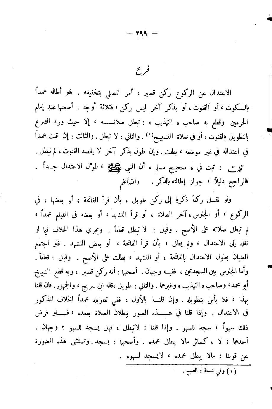 الِاعْتِدَالُ عَنِ الرُّكُوعِ رُكْنٌ قَصِيرٌ، أُمِرَ الْمُصَلِّي بِتَخْفِيفِهِ. فَلَوْ أَطَالَهُ عَمْدًا بِالسُّكُوتِ أَوِ الْقُنُوتِ أَوْ بِذِكْرٍ آخَرَ لَيْسَ بِرُكْنٍ، فَثَلَاثَةُ أَوْجُهٍ أَصَحُّهَا عِنْدَ إِمَامِ الْحَرَمَيْنِ وَقَطَعَ بِهِ صَاحِبُ (التَّهْذِيبِ) : تَبْطُلُ صَلَاتُهُ إِلَّا حَيْثُ وَرَدَ الشَّرْعُ بِالتَّطْوِيلِ بِالْقُنُوتِ، أَوْ فِي صَلَاةِ التَّسْبِيحِ. وَالثَّانِي: لَا تَبْطُلُ. وَالثَّالِثُ: إِنْ قَنَتَ عَمْدًا فِي اعْتِدَالِهِ فِي غَيْرِ مَوْضِعِهِ بَطَلَتْ. وَإِنْ طَوَّلَ بِذِكْرٍ آخَرَ لَا يَقْصِدُ الْقُنُوتَ لَمْ تَبْطُلْ.