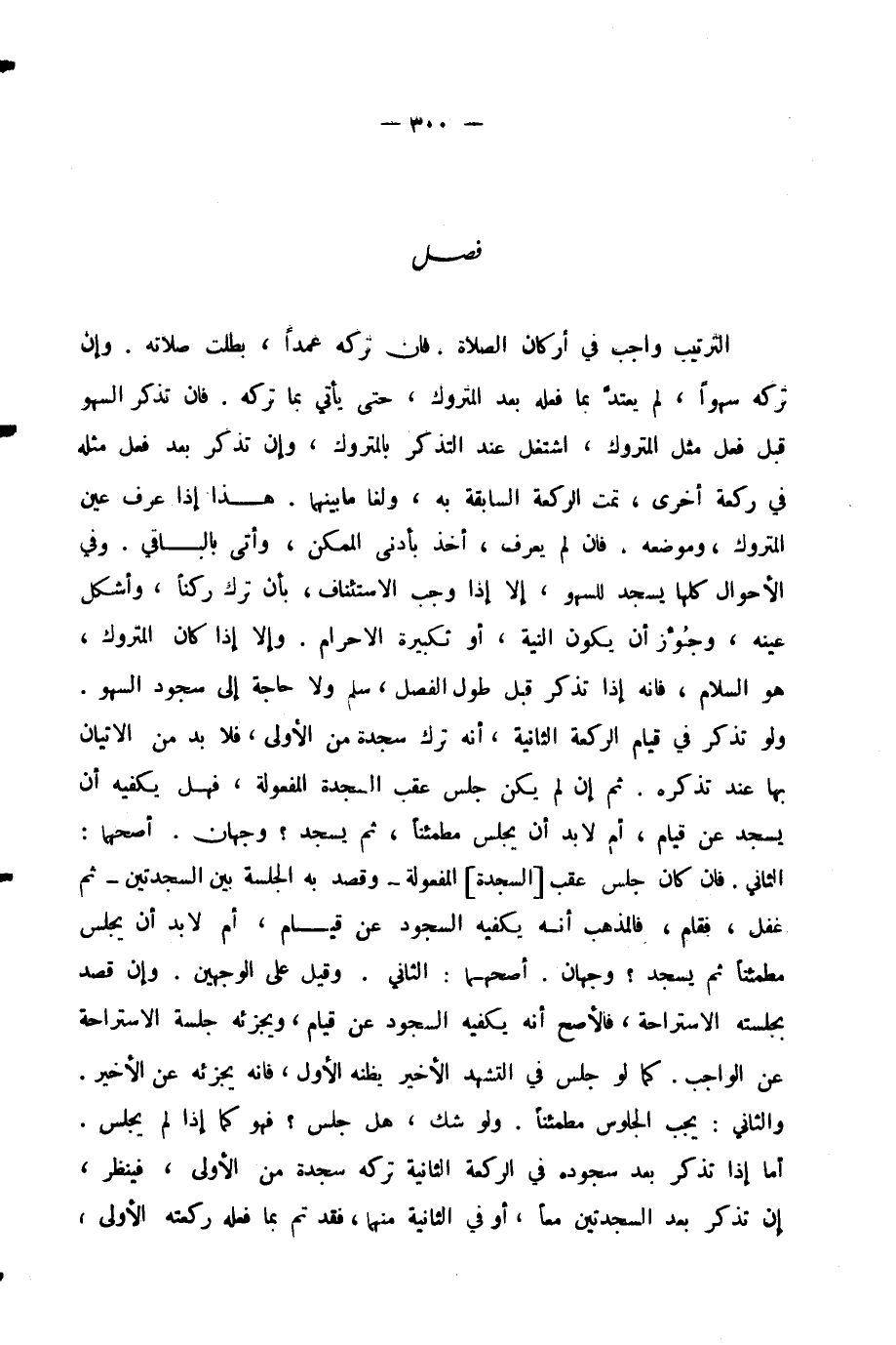 التَّرْتِيبُ وَاجِبٌ فِي أَرْكَانِ الصَّلَاةِ. فَإِنْ تَرَكَهُ عَمْدًا بَطَلَتْ صَلَاتُهُ. وَإِنْ تَرَكَهُ سَهْوًا لَمْ يُعْتَدَّ بِمَا فَعَلَهُ بَعْدَ الْمَتْرُوكِ، حَتَّى يَأْتِيَ بِمَا تَرَكَهُ. فَإِنْ تَذَكَّرَ السَّهْوَ قَبْلَ فِعْلِ مِثْلِ الْمَتْرُوكِ اشْتَغَلَ عِنْدَ التَّذَكُّرِ بِالْمَتْرُوكِ، وَإِنْ تَذَكَّرَ بَعْدَ فِعْلِ مِثْلِهِ فِي رَكْعَةٍ أُخْرَى تَمَّتِ الرَّكْعَةُ السَّابِقَةُ بِهِ، وَلَغَا مَا بَيْنَهُمَا. هَذَا إِذَا عَرَفَ عَيْنَ الْمَتْرُوكِ وَمَوْضِعَهُ. فَإِنْ لَمْ يَعْرِفْ أَخَذَ بِأَدْنَى الْمُمْكِنِ وَأَتَى بِالْبَاقِي. وَفِي الْأَحْوَالِ كُلِّهَا يَسْجُدُ لِلسَّهْوِ، إِلَّا إِذَا وَجَبَ الِاسْتِئْنَافُ، بِأَنْ تَرَكَ رُكْنًا وَأَشْكَلَ عَيْنُهُ وَجُوِّزَ أَنْ يَكُونَ النِّيَّةَ أَوْ تَكْبِيرَةَ الْإِحْرَامِ. وَإِلَّا إِذَا كَانَ الْمَتْرُوكُ هُوَ السَّلَامُ، فَإِنَّهُ إِذَا تَذَكَّرَ قَبْلَ طُولِ الْفَصْلِ، سَلَّمَ وَلَا حَاجَةَ إِلَى سُجُودِ السَّهْوِ. وَلَوْ تَذَكَّرَ فِي قِيَامِ الرَّكْعَةِ الثَّانِيَةِ، أَنَّهُ تَرَكَ سَجْدَةً مِنَ الْأُولَى، فَلَا بُدَّ مِنَ الْإِتْيَانِ بِهَا عِنْدَ تَذَكُّرِهِ. ثُمَّ إِنْ لَمْ يَكُنْ جَلَسَ عَقِبَ السَّجْدَةِ الْمَفْعُولَةِ، فَهَلْ يَكْفِيهِ أَنْ يَسْجُدَ عَنْ قِيَامٍ، أَمْ لَا بُدَّ أَنْ يَجْلِسَ مُطْمَئِنًّا، ثُمَّ يَسْجُدُ؟ وَجْهَانِ. أَصَحُّهُمَا: الثَّانِي. فَإِنْ كَانَ جَلَسَ عَقِبَ [السَّجْدَةِ] الْمَفْعُولَةِ - وَقَصَدَ بِهِ الْجَلْسَةَ بَيْنَ السَّجْدَتَيْنِ - ثُمَّ غَفَلَ فَقَامَ، فَالْمَذْهَبُ أَنَّهُ يَكْفِيهِ السُّجُودُ عَنْ قِيَامٍ. وَقِيلَ عَلَى الْوَجْهَيْنِ. وَإِنْ قَصَدَ بِجَلْسَتِهِ الِاسْتِرَاحَةَ، فَالْأَصَحُّ أَنَّهُ يَكْفِيهِ السُّجُودُ عَنْ قِيَامٍ، وَيُجْزِئُهُ جَلْسَةُ الِاسْتِرَاحَةِ عَنِ الْوَاجِبِ. كَمَا لَوْ جَلَسَ فِي التَّشَهُّدِ الْأَخِيرِ يَظُنُّهُ الْأَوَّلَ، فَإِنَّهُ يُجْزِئُهُ عَنِ الْأَخِيرِ. وَالثَّانِي: يَجِبُ الْجُلُوسُ مُطْمَئِنًّا. وَلَوْ شَكَّ، هَلْ جَلَسَ؟ فَهُوَ كَمَا إِذَا لَمْ يَجْلِسْ. أَمَّا إِذَا تَذَكَّرَ بَعْدَ سُجُودِهِ فِي الرَّكْعَةِ الثَّانِيَةِ تَرْكَهُ سَجْدَةً مِنَ الْأُولَى، فَيَنْظُرُ، إِنْ تَذَكَّرَ بَعْدَ السَّجْدَتَيْنِ مَعًا، أَوْ فِي الثَّانِيَةِ مِنْهُمَا، فَقَدْ تَمَّ بِمَا فَعَلَهُ رَكْعَتُهُ الْأُولَى،