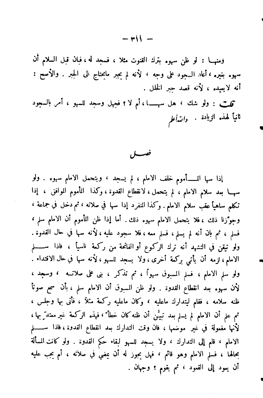إِذَا سَهَا الْمَأْمُومُ خَلْفَ الْإِمَامِ، لَمْ يَسْجُدْ، وَيَتَحَمَّلُ الْإِمَامُ سَهْوَهُ. وَلَوْ سَهَا بَعْدَ سَلَامِ الْإِمَامِ لَمْ يَتَحَمَّلْ، لِانْقِطَاعِ الْقُدْوَةِ، وَكَذَا الْمَأْمُومُ الْمُوَافِقُ، إِذَا تَكَلَّمَ سَاهِيًا عَقِبَ سَلَامِ الْإِمَامِ. وَكَذَا الْمُنْفَرِدُ إِذَا سَهَا فِي صَلَاتِهِ، ثُمَّ دَخَلَ فِي جَمَاعَةٍ، وَجَوَّزْنَا ذَلِكَ، فَلَا يَتَحَمَّلُ الْإِمَامُ سَهْوَهُ ذَلِكَ. أَمَّا إِذَا ظَنَّ الْمَأْمُومُ أَنَّ الْإِمَامَ سَلَّمَ فَسَلَّمَ، ثُمَّ بَانَ أَنَّهُ لَمْ يُسَلِّمْ، فَسَلَّمَ مَعَهُ، فَلَا سُجُودَ عَلَيْهِ، لِأَنَّهُ سَهَا فِي حَالِ الْقُدْوَةِ. وَلَوْ تَيَقَّنَ فِي التَّشَهُّدِ أَنَّهُ تَرَكَ الرُّكُوعَ أَوِ الْفَاتِحَةَ مِنْ رَكْعَةٍ نَاسِيًا، فَإِذَا سَلَّمَ الْإِمَامُ، لَزِمَهُ أَنْ يَأْتِيَ بِرَكْعَةٍ أُخْرَى، وَلَا يَسْجُدُ لِلسَّهْوِ، لِأَنَّهُ سَهَا فِي حَالِ الِاقْتِدَاءِ. وَلَوْ سَلَّمَ الْإِمَامُ، فَسَلَّمَ الْمَسْبُوقُ سَهْوًا، ثُمَّ تَذَكَّرَ، بَنَى عَلَى صَلَاتِهِ، وَسَجَدَ، لِأَنَّ سَهْوَهُ بَعْدَ انْقِطَاعِ الْقُدْوَةِ. وَلَوْ ظَنَّ الْمَسْبُوقُ أَنَّ الْإِمَامَ سَلَّمَ، بِأَنْ سَمِعَ صَوْتًا ظَنَّهُ سَلَامَهُ، فَقَامَ لِيَتَدَارَكَ مَا عَلَيْهِ، وَكَانَ مَا عَلَيْهِ رَكْعَةً مَثَلًا، فَأَتَى بِهَا وَجَلَسَ، ثُمَّ عَلِمَ أَنَّ الْإِمَامَ لَمْ يُسَلِّمْ بَعْدَ تَبَيُّنِ أَنَّ ظَنَّهُ كَانَ خَطَأً، فَهَذِهِ الرَّكْعَةُ غَيْرُ مُعْتَدٍّ بِهَا. لِأَنَّهَا مَفْعُولَةٌ فِي غَيْرِ مَوْضِعِهَا، فَإِنَّ وَقْتَ التَّدَارُكِ بَعْدَ انْقِطَاعِ الْقُدْوَةِ، فَإِذَا سَلَّمَ الْإِمَامُ، قَامَ إِلَى التَّدَارُكِ، وَلَا يَسْجُدُ لِلسَّهْوِ لِبَقَاءِ حُكْمِ الْقُدْوَةِ. وَلَوْ كَانَتِ الْمَسْأَلَةُ بِحَالِهَا، فَسَلَّمَ الْإِمَامُ وَهُوَ قَائِمٌ، فَهَلْ يَجُوزُ لَهُ أَنْ يَمْضِيَ فِي صَلَاتِهِ، أَمْ يَجِبُ عَلَيْهِ أَنْ يَعُودَ إِلَى الْقُعُودِ، ثُمَّ يَقُومَ؟ وَجْهَانِ.
