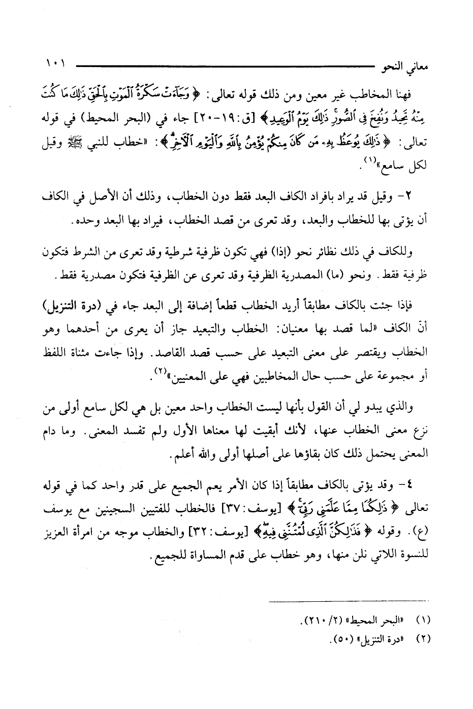 فإذا جئت بالكاف مطابقًا أريد الخطاب قطعا إضافة إلى البعد جاء في (درة التنزيل) أن الكاف " لما قصد بها معنيان: الخطاب والتبعيد جاز أن يعري من أحدما وهو الخطاب ويقتصر على معنى التبعيد على حسب قصد القاصد. وإذا جاءت مثناة اللفظ أو مجموعة على حسب حال المخاطبين فهي على المعنيين". (¬2)