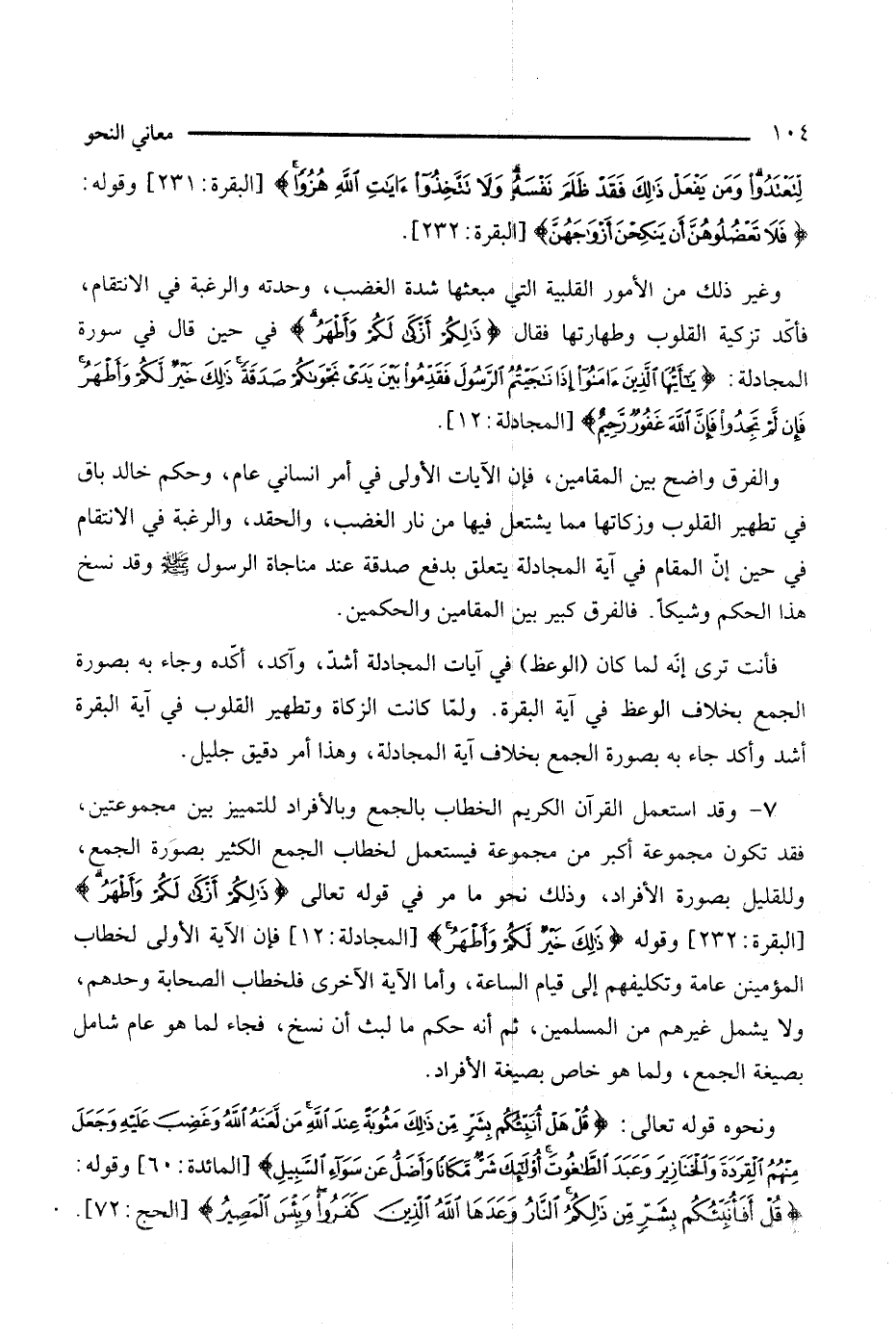 7 - وقد استعمل القرآن الكريم الخطاب بالجمع، وبالأفراد للتمييز بين مجموعتين، فقد تكون مجموعة أكبر من مجموعة فيستعمل لخطاب الجمع الكثير بصورة الجمع، وللقليل بصورة الأفراد، وذلك نحو ما مر في قوله تعالى: {ذلكم أزكي لكم وأطهر} [البقرة: 232]، وقوله: {ذلك خير لكم وأطهر} [المجادلة: 12]، فإن الآية الأولى لخطاب المؤمنين عامة وتكليفهم إلى قيام الساعة، وأما الآية الأخرى فلخطاب الصحابة وحدهم، ولا يشمل غيرهم من المسلمين ثم أنه حكم ما لبث أن نسخ، فجاء لما هو عام شامل بصيغة الجمع، ولما هو خاص بصيغة الأفراد.