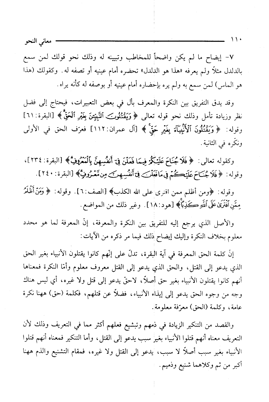 وقد يدق التفريق بين النكرة والمعرف بأل في بعض التعبيرات فيحتاج إلى فضل نظر وزيادة تأمل وذلك نحو قوله تعالى {ويقتلون النبين بغير الحق} [البقرة: 61] وقوله: {ويقتلون الأنبياء بغير حق} [آل عمران: 112]، فعرف الحق في الأولى ونكره في الثانية.