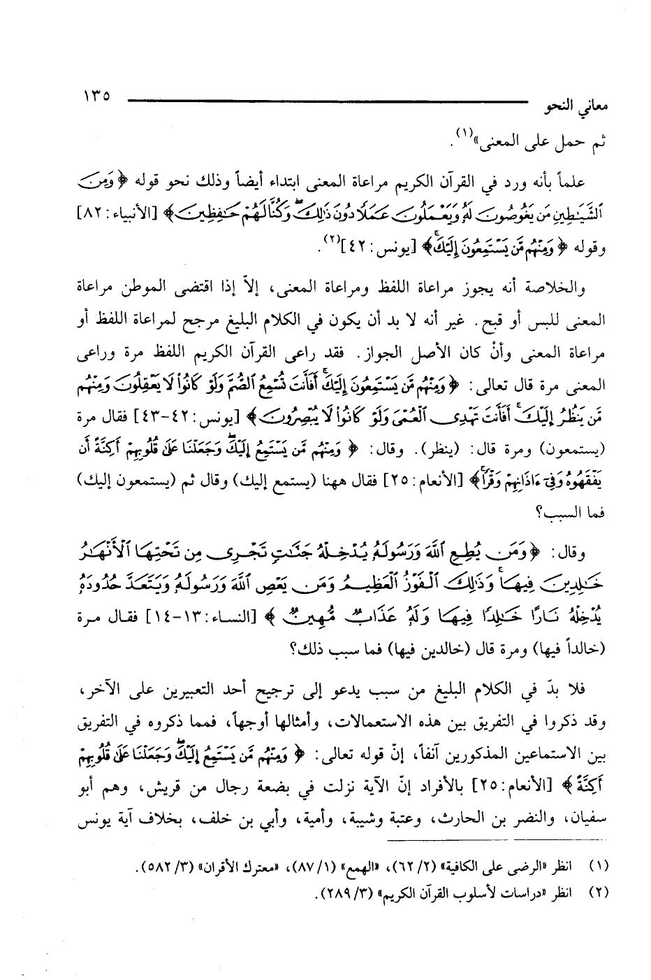 والخلاصة أنه يجوز مراعاة اللفظ ومراعاة المعنى، إلا إذا اقتضي الموطن مراعاة المعنى للبس أو قبح. غير أنه لا بد أن يكون في الكلام البليغ مرجح لمراعاة اللفظ أو مراعاة المعنى وأن كان الأصل الجواز. فقد راعى القرآن الكريم اللفظ مرة وراعى المعنى مرة قال تعالى: {منهم من يستمعون إليك أفأنت تسمع الصم ولو كانوا لا يعقلون ومنهم من ينظر إليك أفأنت تهدي العمي ولو كانوا لا يبصرون} [يونس: 42 - 43]، فقال مرة (يستمعون) ومرة قال: (ينظر). وقال: {ومنهم من يستمع إليك وجعلنا على قلوبهم أكنة أن يفقهوه وفي أذانهم وقرا} [الأنعام: 25]، فقال ههنا (يستمع إليك) وقال ثم (يستمعون إليك) فما السبب؟